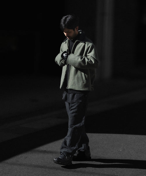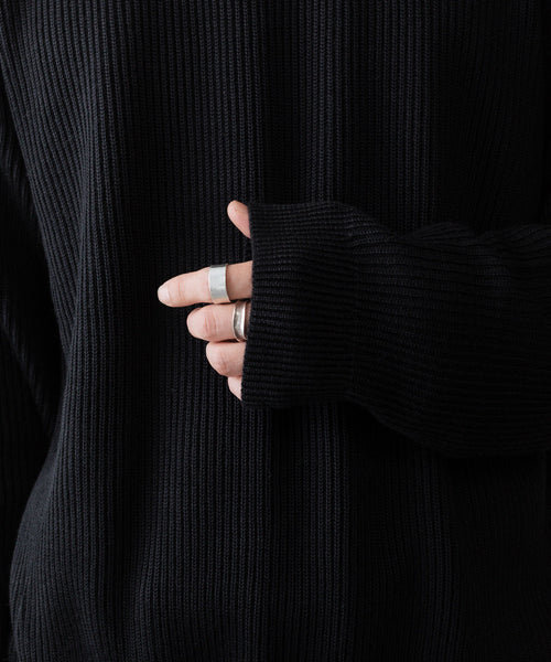 本来であればスーパーハイゲージニット用に使われる極めて細番手の糸を超多本取りして製作したクルーネックセーター。これだけの細番手を超多本取りにするだけでも非常に難易度が高い中、熟練のニッターの手によって両畦での成型編みにトライしました。フォルムは18世紀から続く英国の老舗ニットウエアカンパニーがフランスを代表する某企業と協業し、アスリート向けのアイテムとして生産したニットをモチーフにしました。当時のものとしては希少な大きめサイズの個体をサンプリングしています。