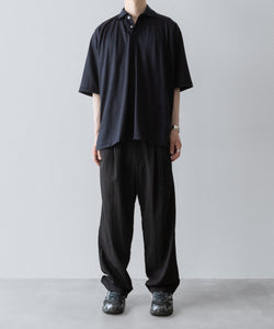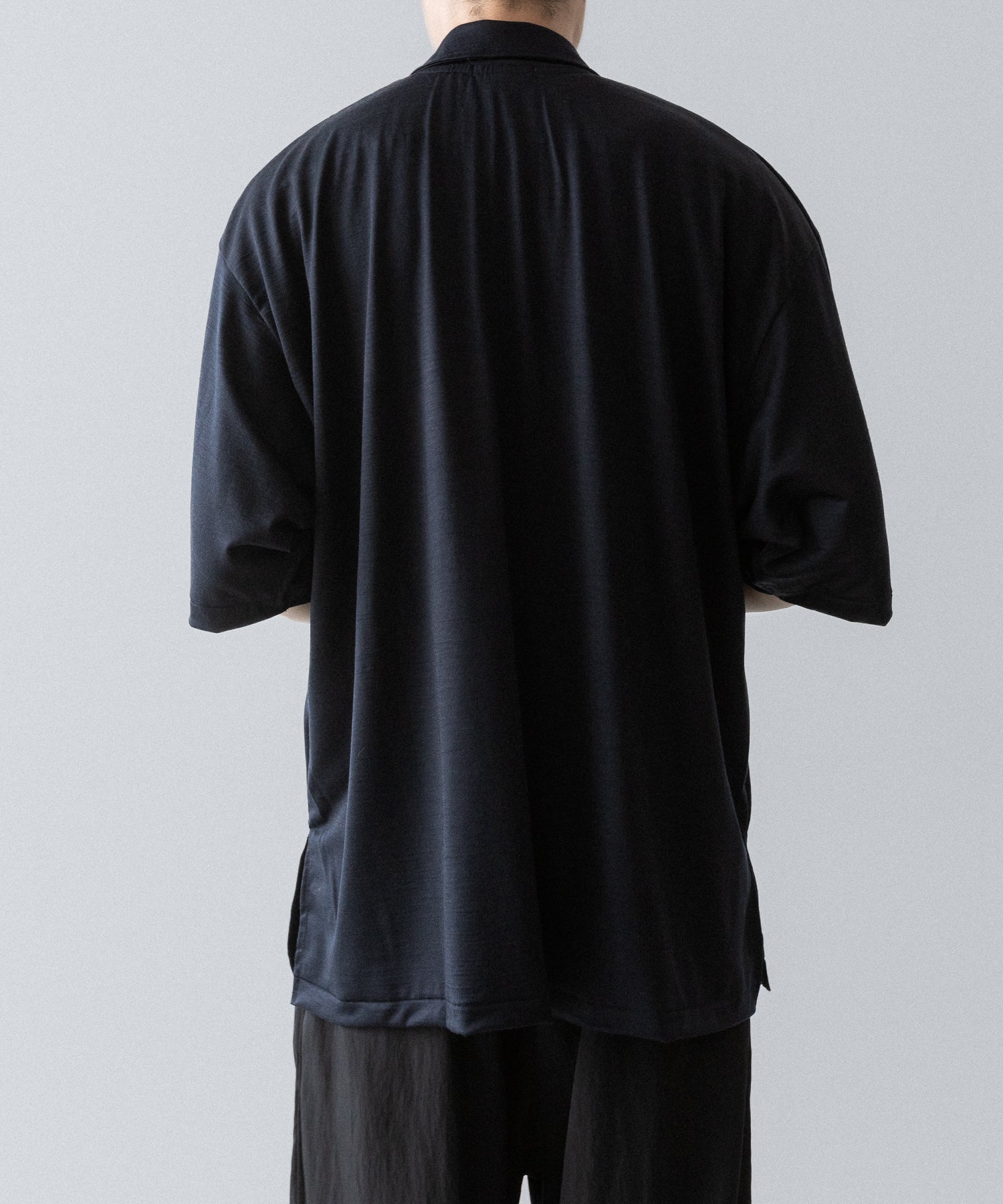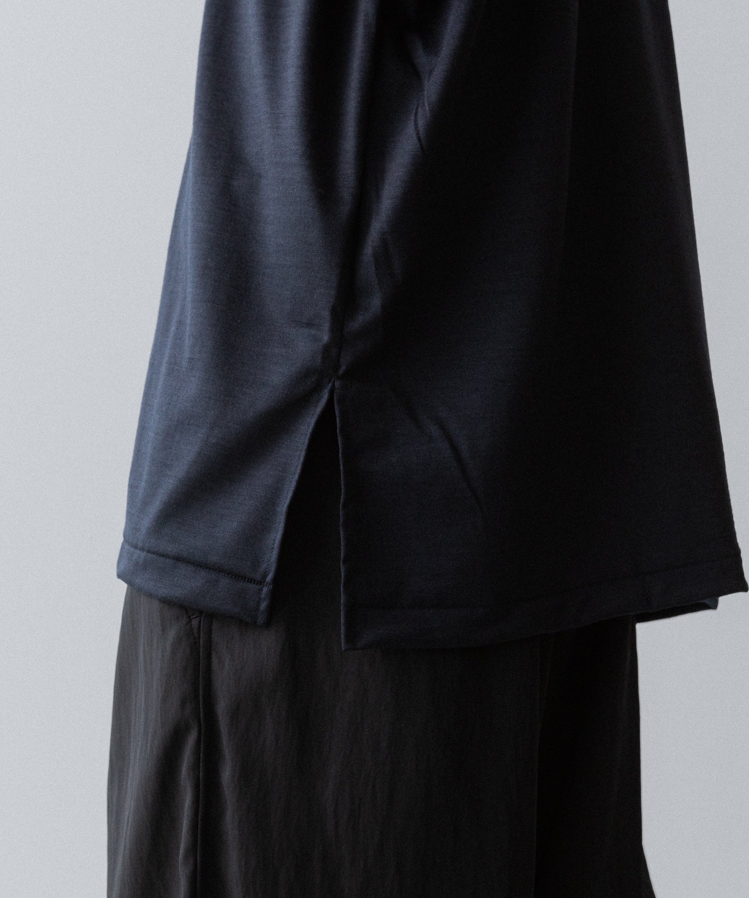 エクストラファインメリノによる48番単糸を使用したオリジナルのウール天竺生地。生機の時点で強い光沢感があるものの、整理加工時にさらに特殊加工を施し光沢感となめらかな表面感、美しい落ち感を表現しています。