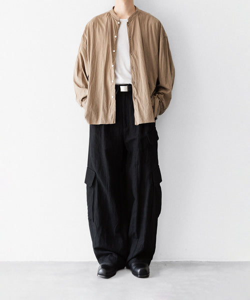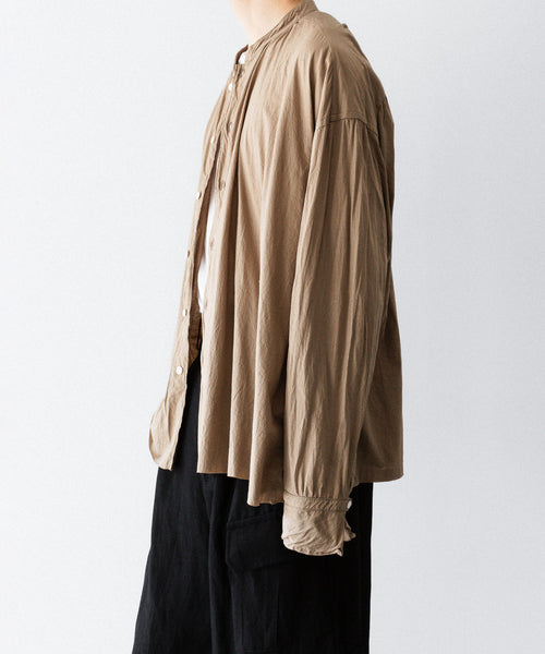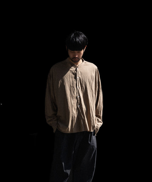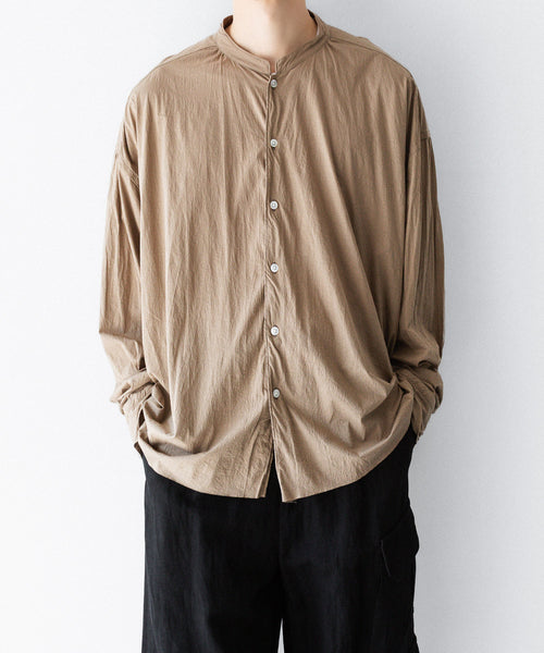 素材に塩縮加工&特殊ガーメントダイを施すことで、独特のシボ感を持ったテクスチャー、奥行きのあるカラーリング、シアー感を表現。乾燥時も1点1点自然乾燥で、素材の風合いを保ちながら仕上げを行なっています。