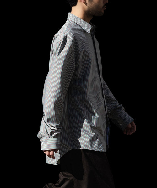 縫製はドレスシャツを踏襲し、全て巻き伏せ本縫い仕様。貝蝶釦使い。