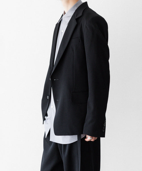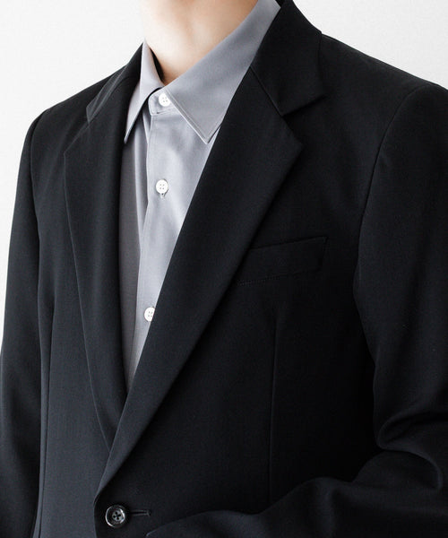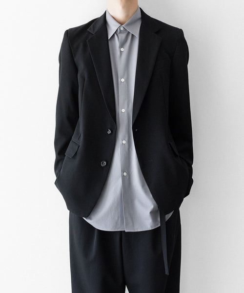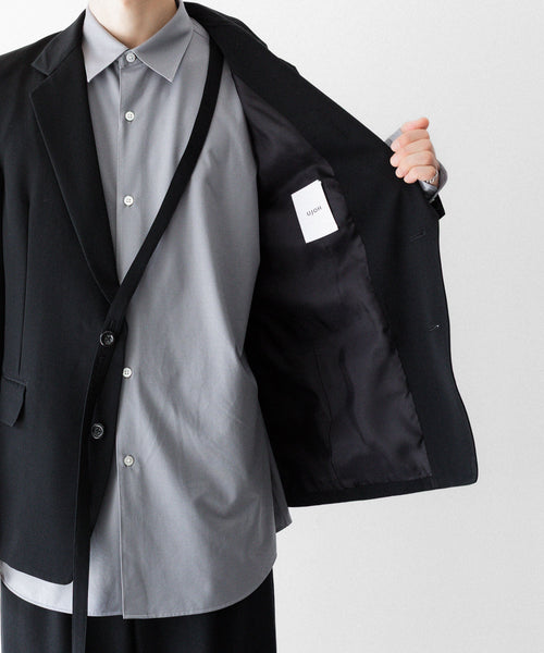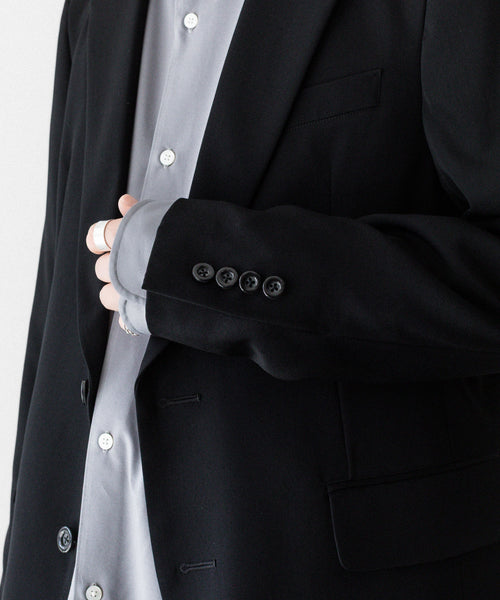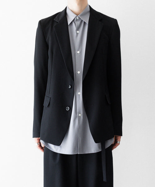 シャープなラペルラインと細身のシルエットが洗練された印象を与える2ボタンジャケットです。