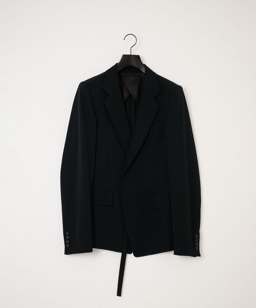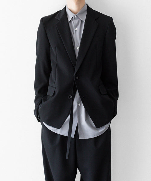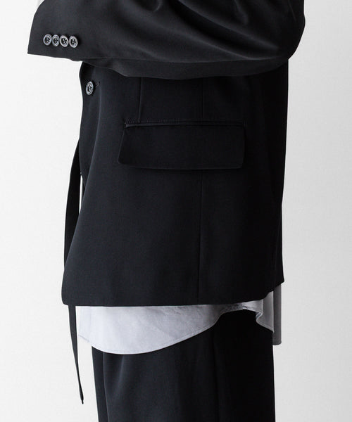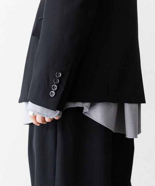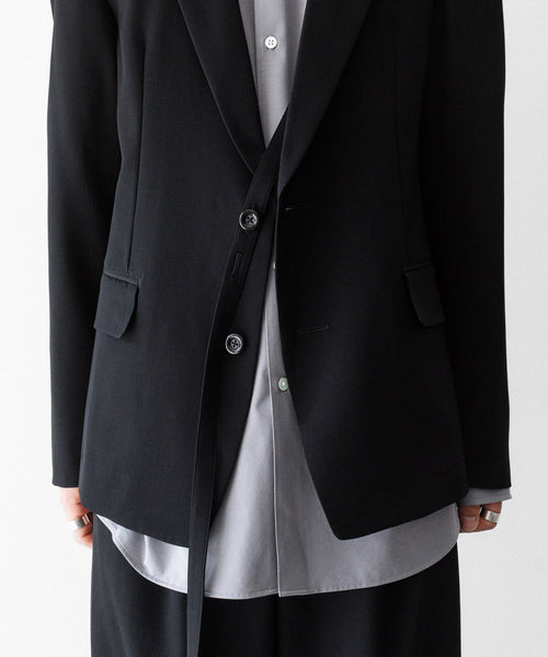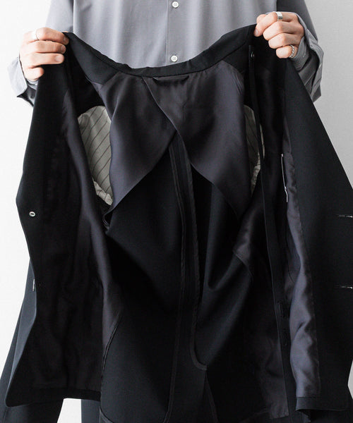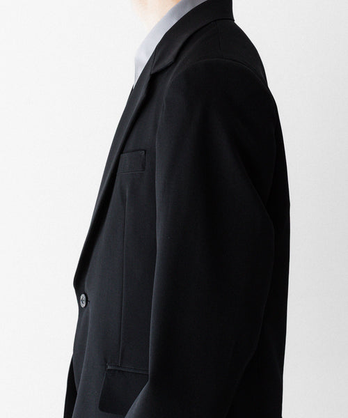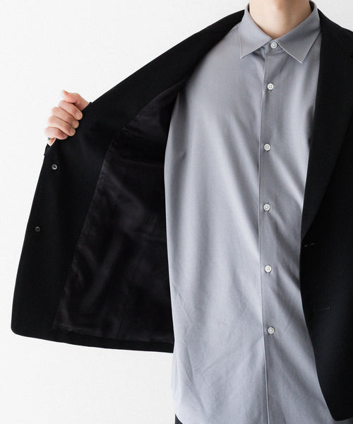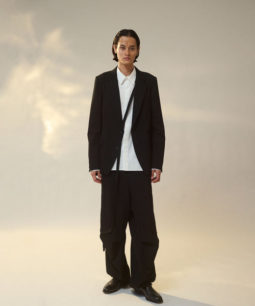 フラップポケットや胸ポケットなどのディテールがクラシックな表現を見せつつ、直線的なカッティングがモードな雰囲気です。