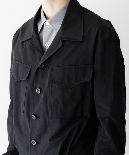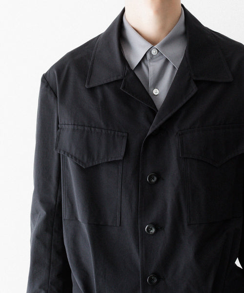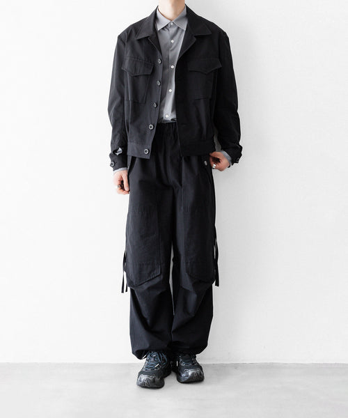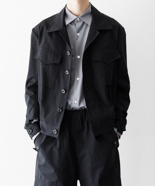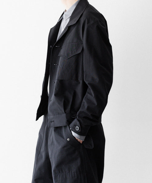 裾や袖口のタブ状の持ち出しや腰回りのタックなどのディテールも特徴です。
