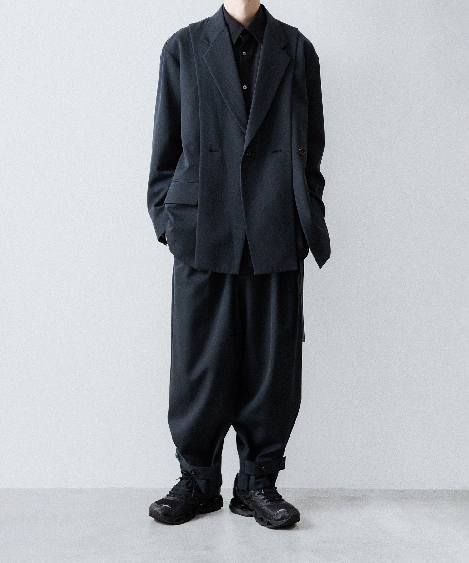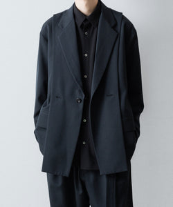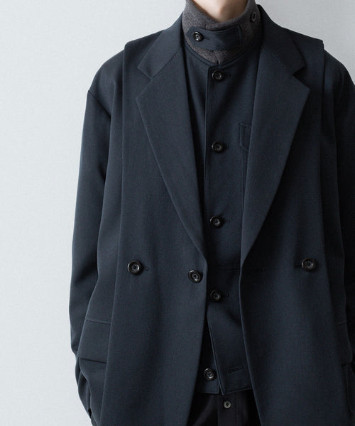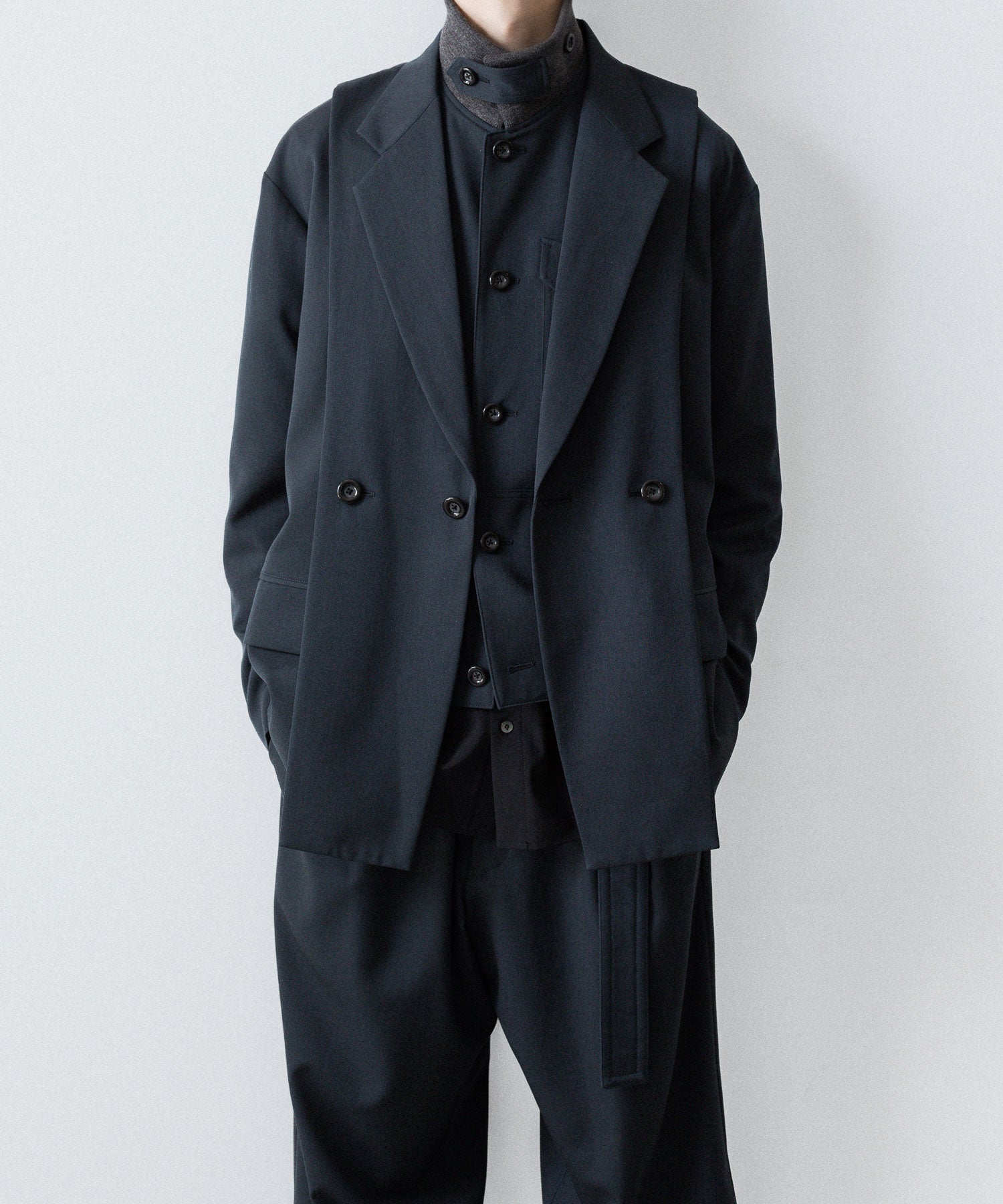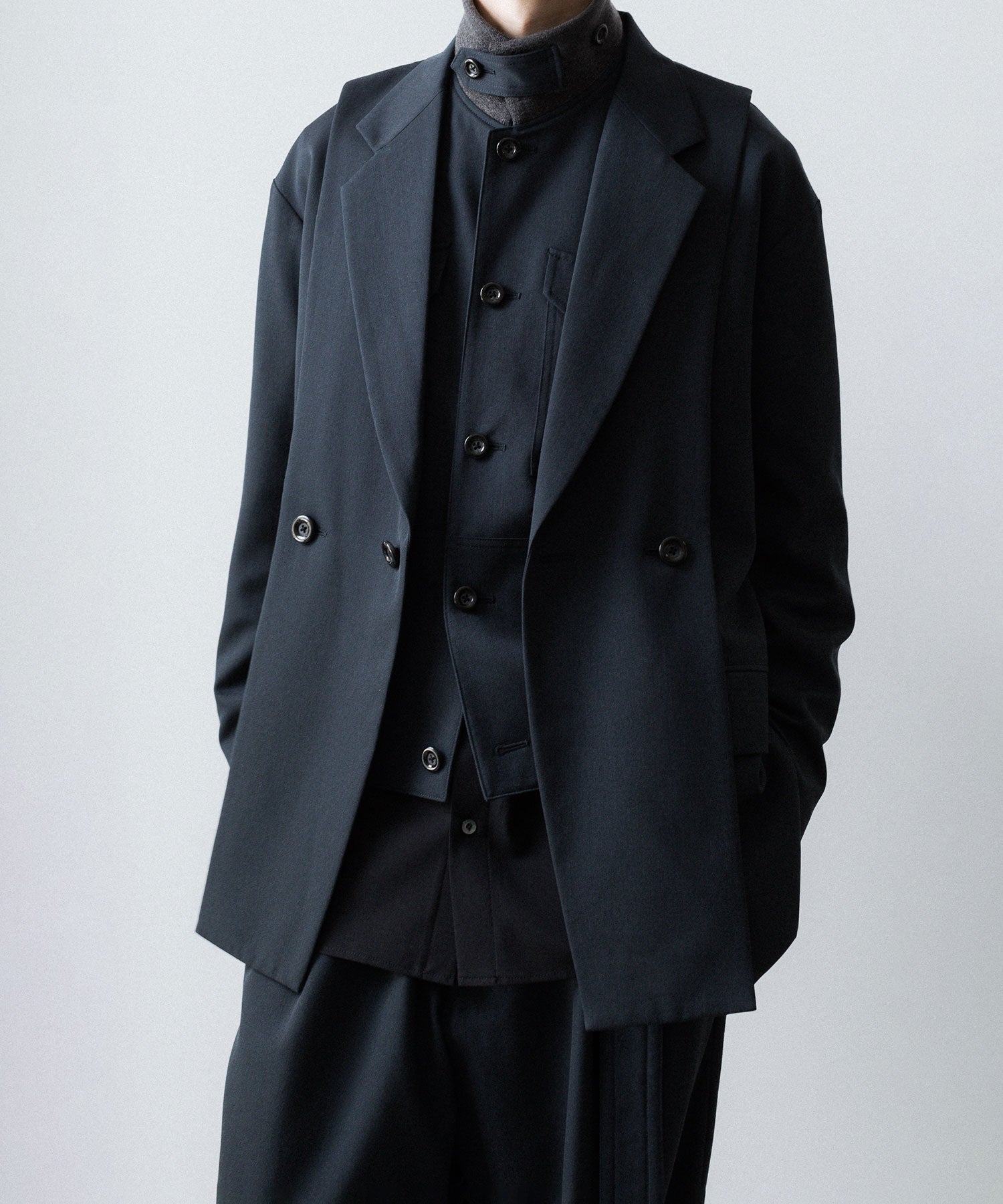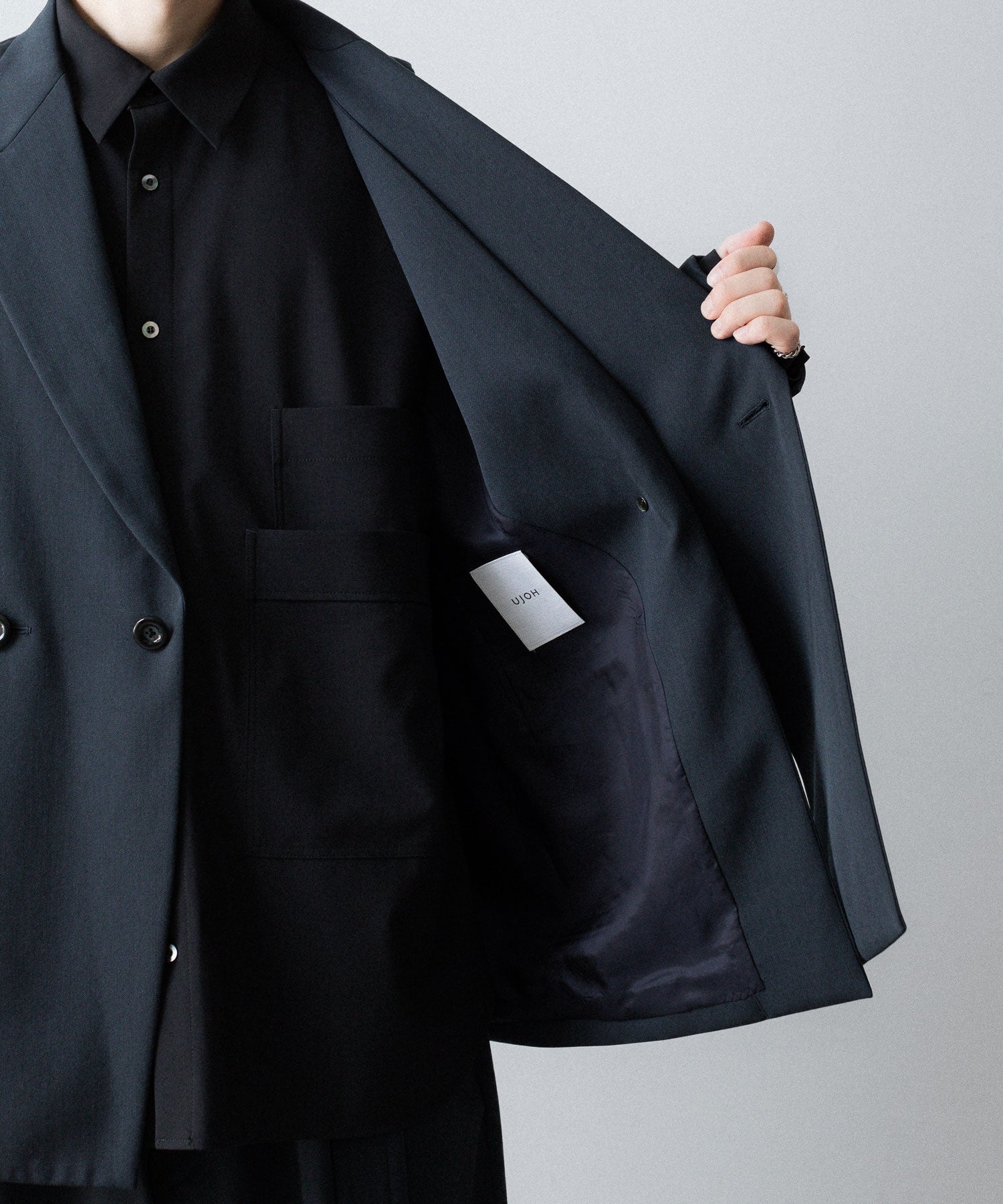フロントは釦で留めたスリットを開けて着たり、スリットに袖を通してベストのように着たりと、UJOHらしい遊びの効いた着方が楽しめる1着です。