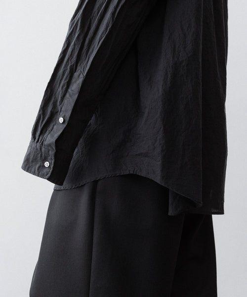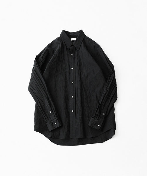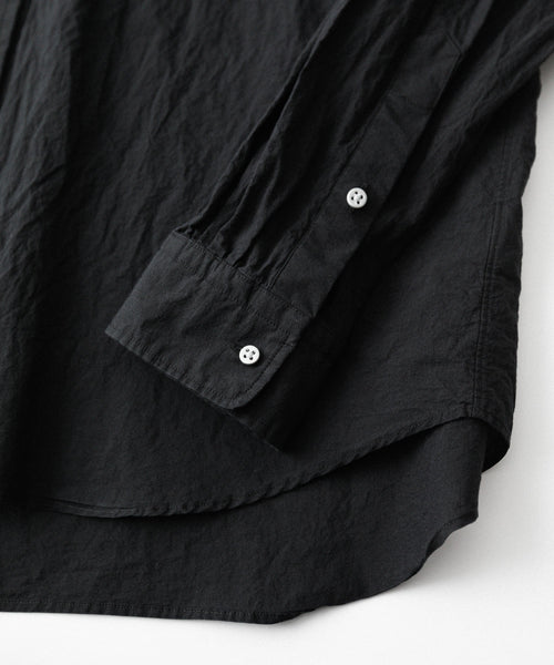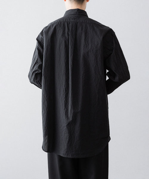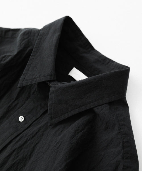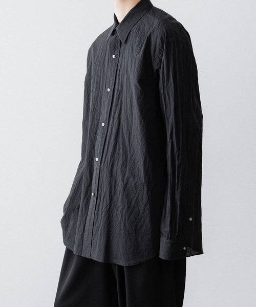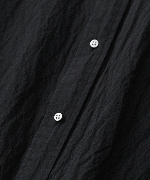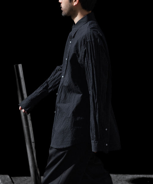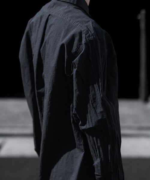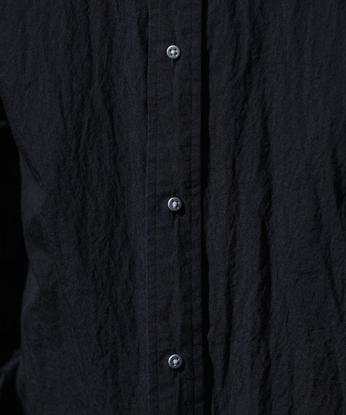 paratrait定番のフロート系のフィッシングラインに着想を得て軽さと清涼感を追求するためにモノフィラメントを縦糸に使用した特殊な素材を加工で追い込んだレギュラーカラー、前たて仕様のコットンシャツです。