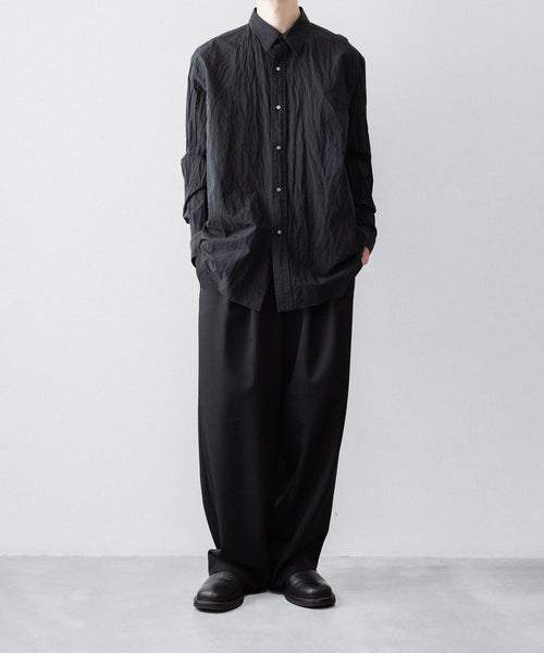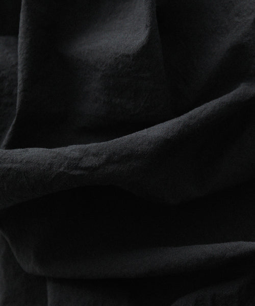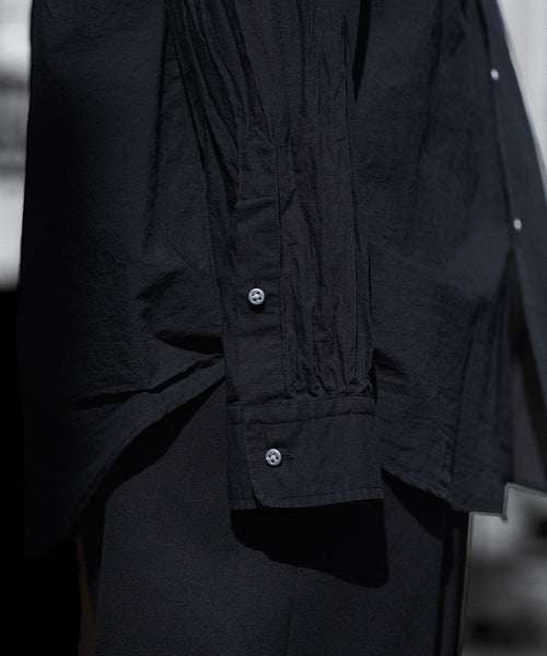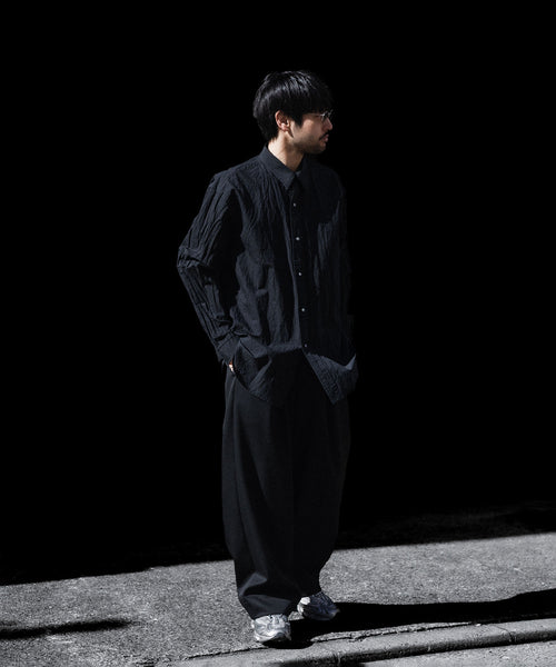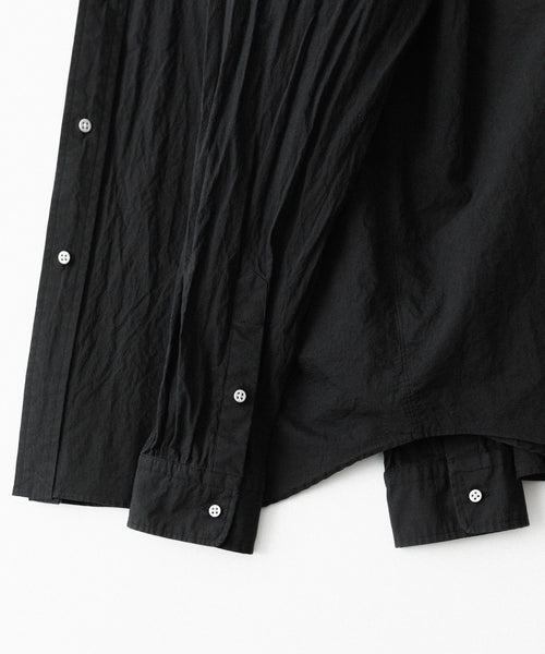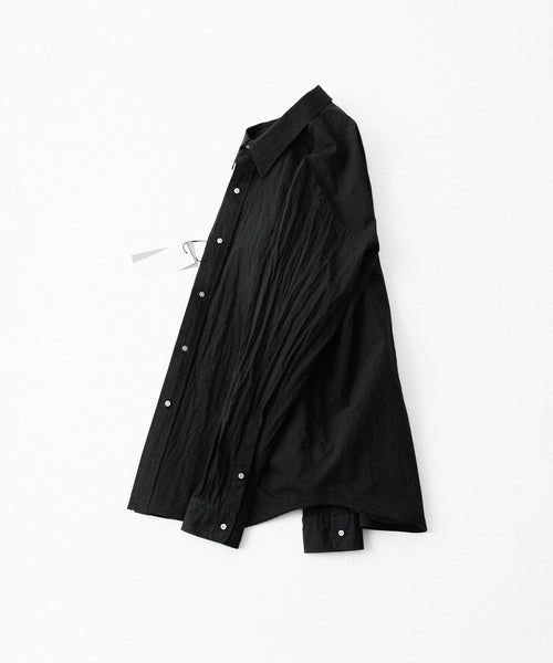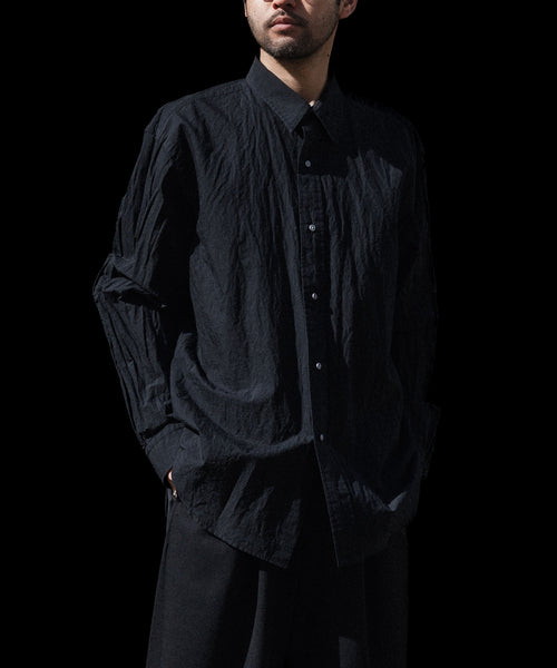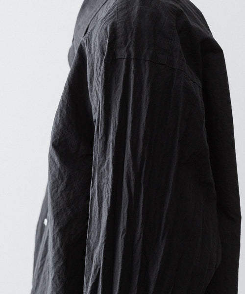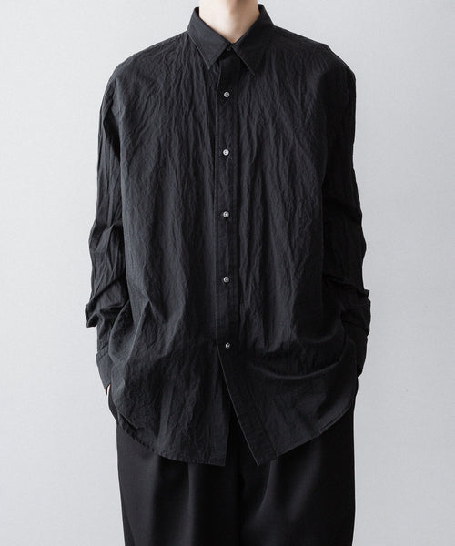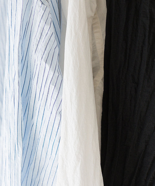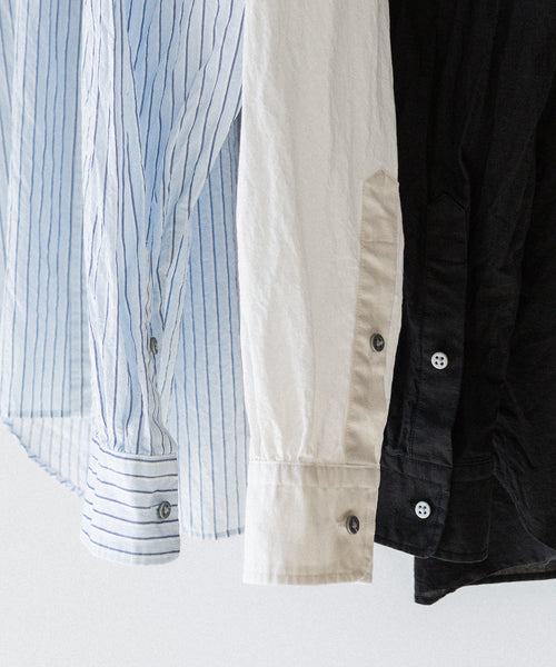 paratrait定番のフロート系のフィッシングラインに着想を得て軽さと清涼感を追求するためにモノフィラメントを縦糸に使用した特殊な素材を加工で追い込んだレギュラーカラー、前たて仕様のコットンシャツです。