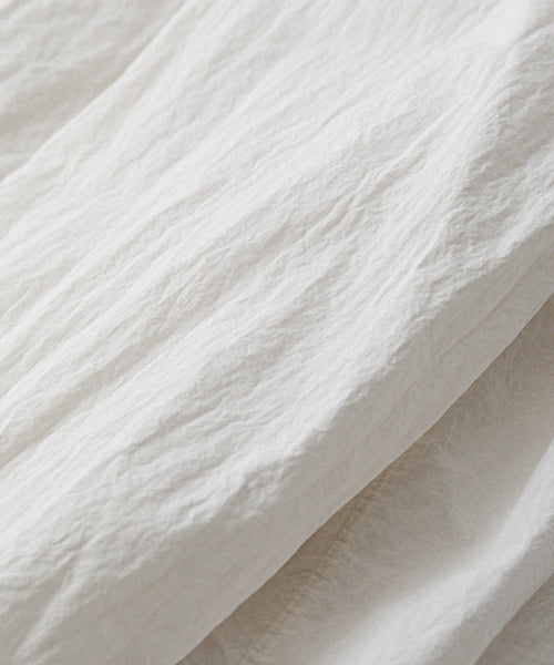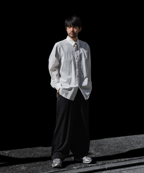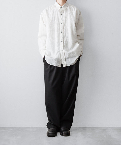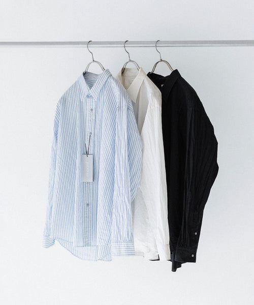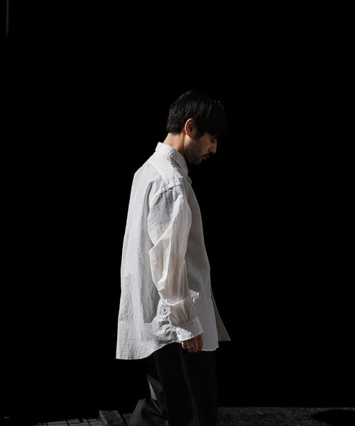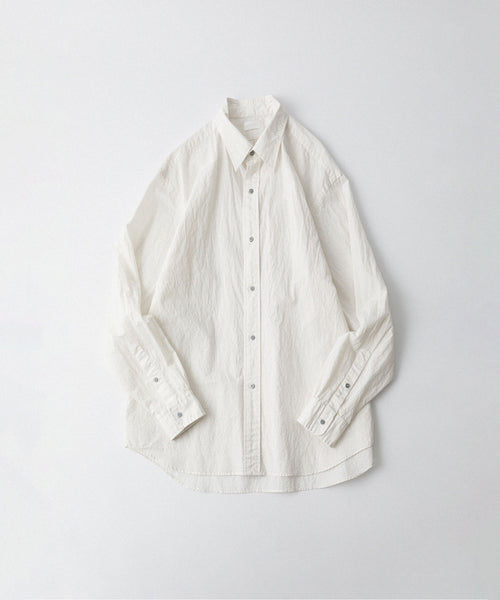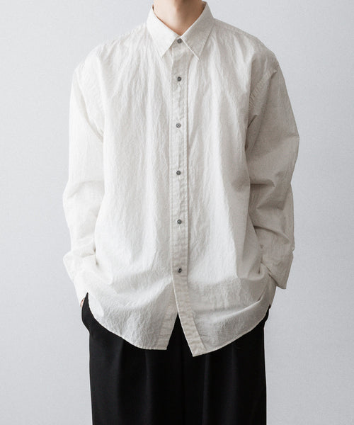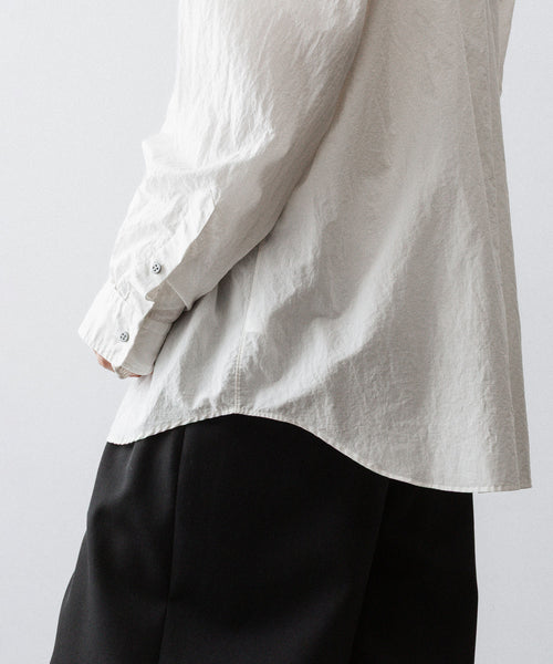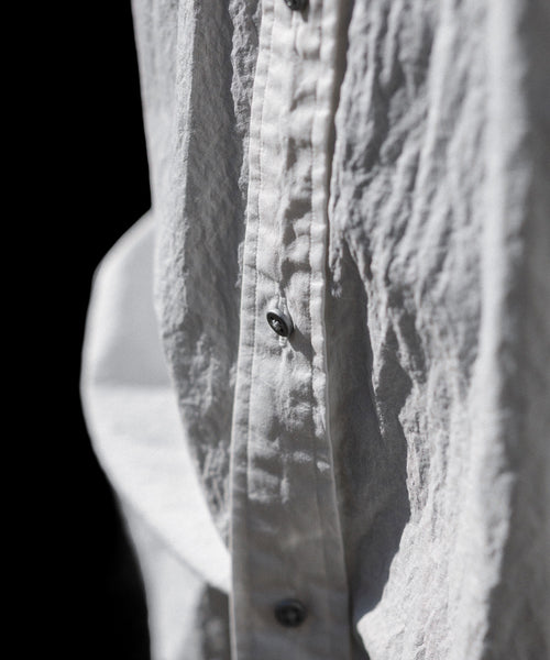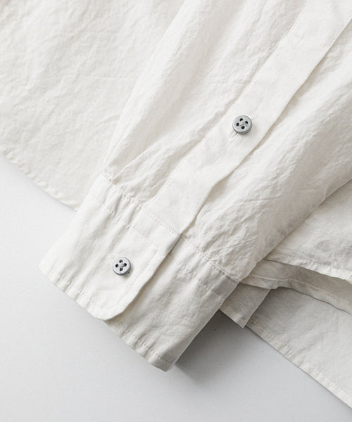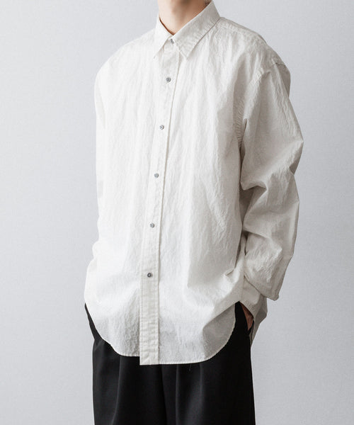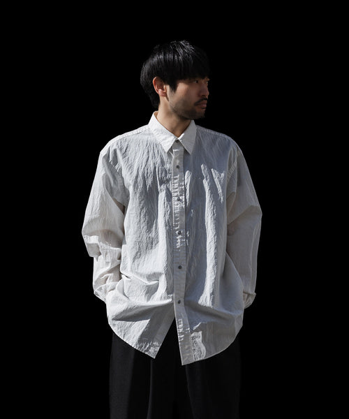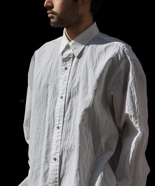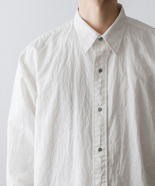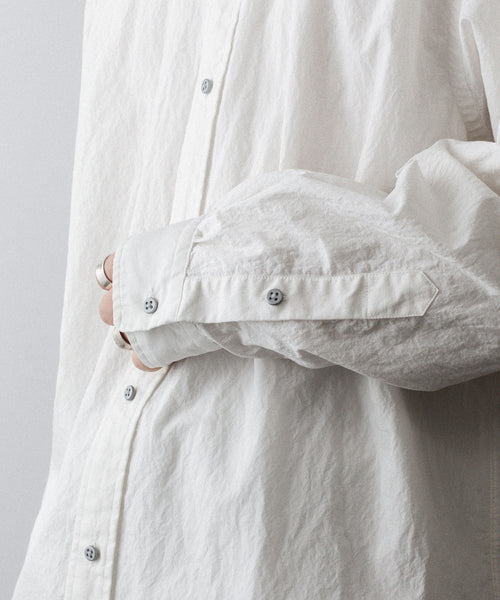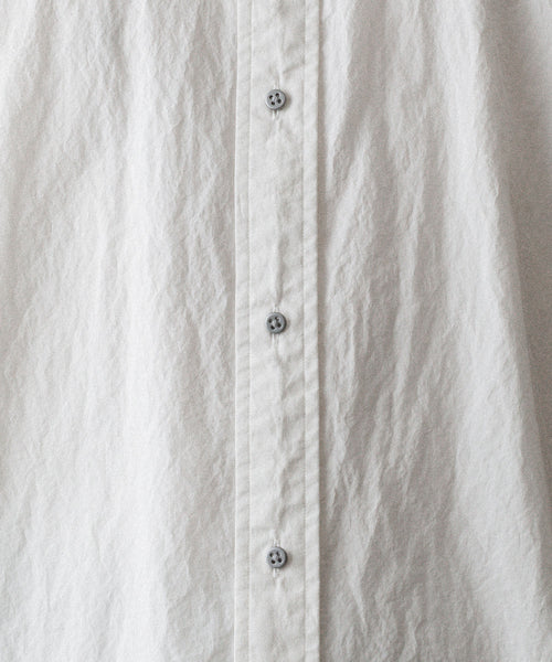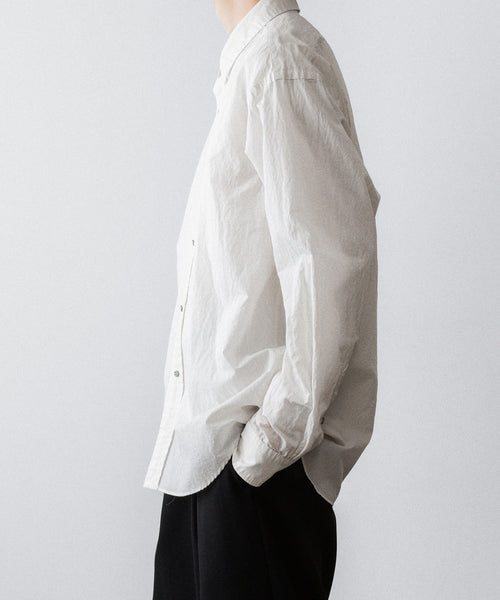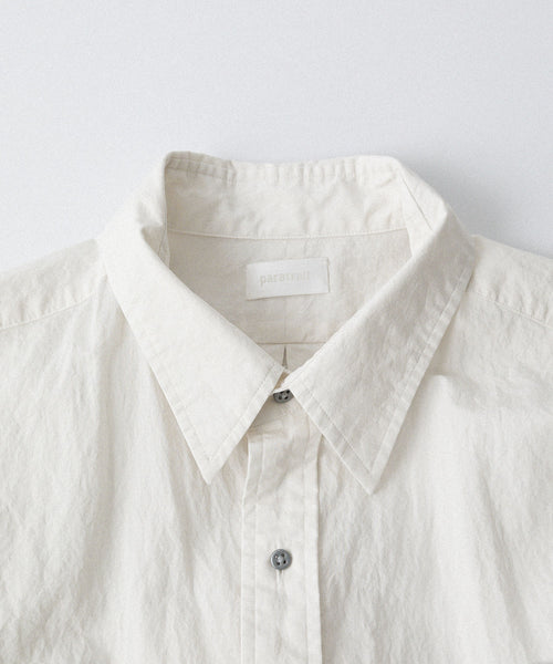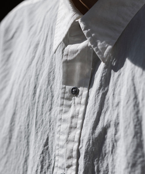 paratrait定番のフロート系のフィッシングラインに着想を得て軽さと清涼感を追求するためにモノフィラメントを縦糸に使用した特殊な素材を加工で追い込んだレギュラーカラー、前たて仕様のコットンシャツです。