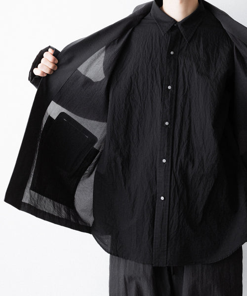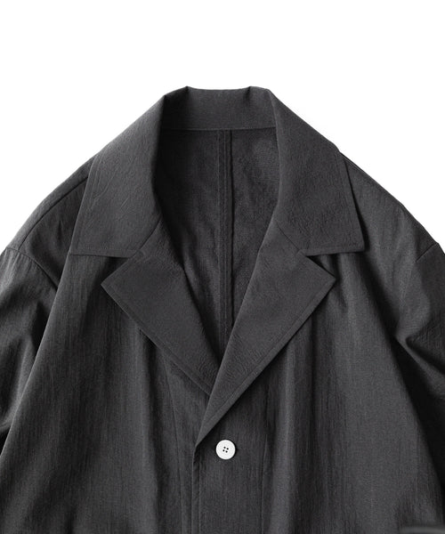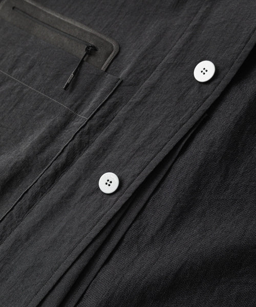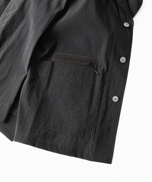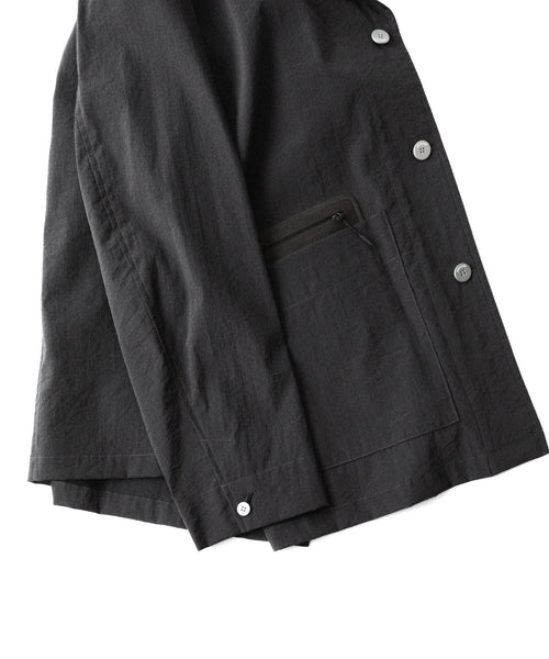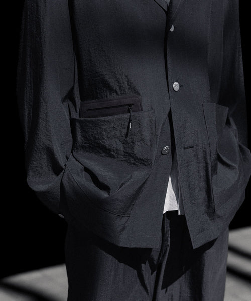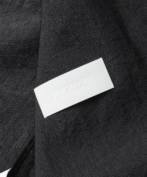 大きめにデザインされた襟が、このジャケットの存在感を引き立てます。高周波とレーザーカットで仕上げられたチェンジポケットと、paratraitオリジナルのボタンが配されています。