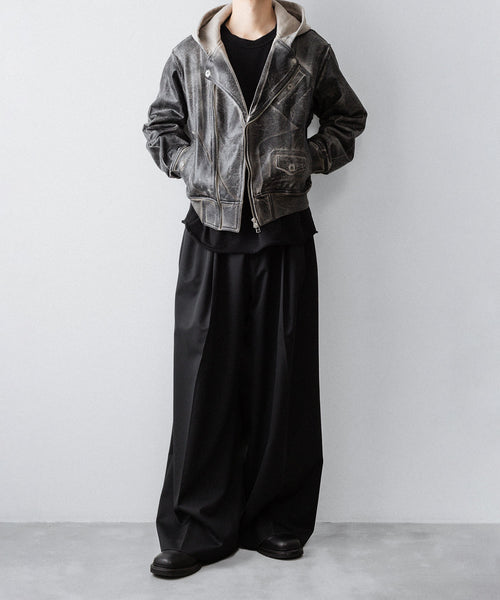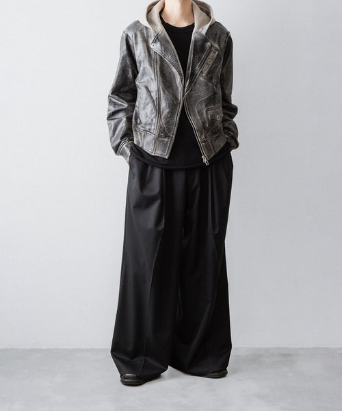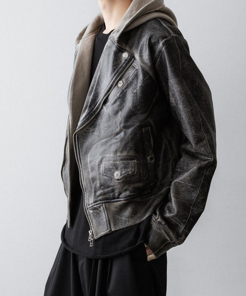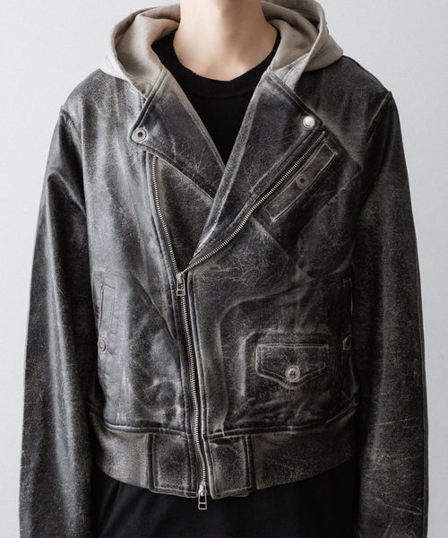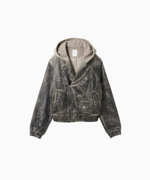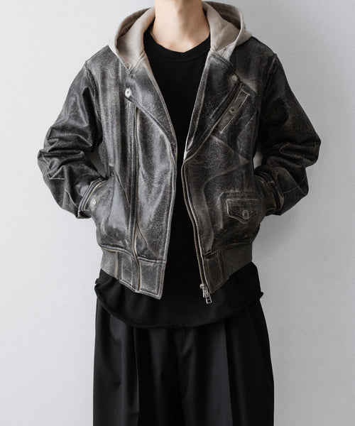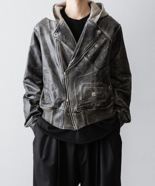 上衿をフードにすることで、ライダースジャケットの下に同素材のフーディをレイヤードしているかのようなトロンプルイユなデザインになっています。