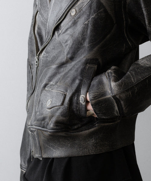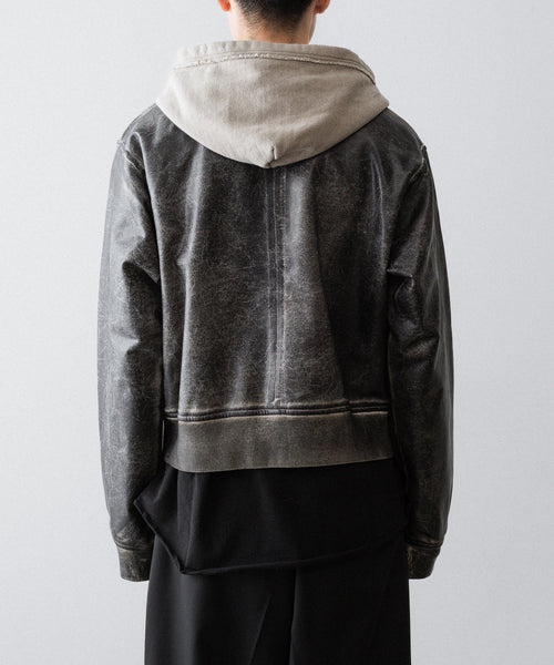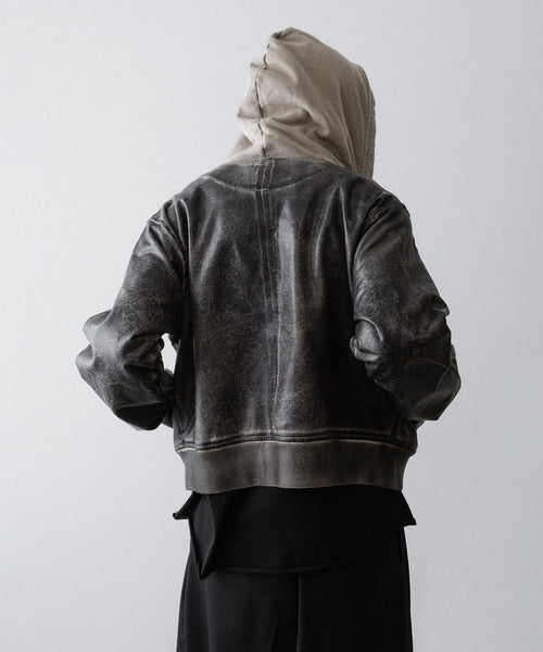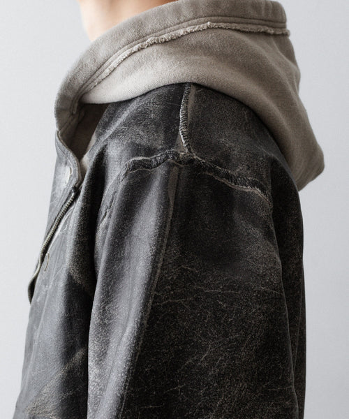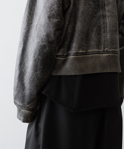 ボディはコットン100%の軽めの裏毛スウェット生地を使用し、裾から肩まではレザークラッキング調のコーティングを施すことで、古着のレザーのような表情に仕上げています。
