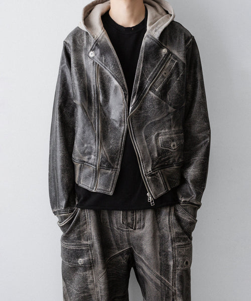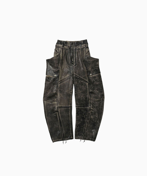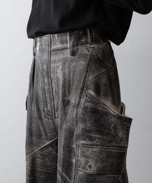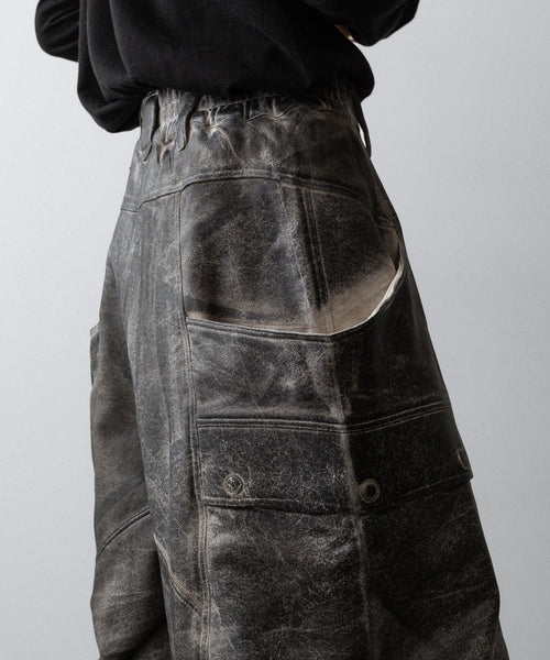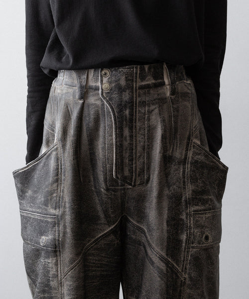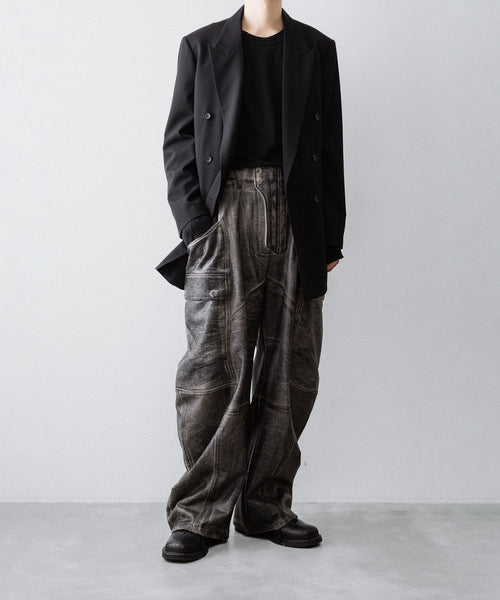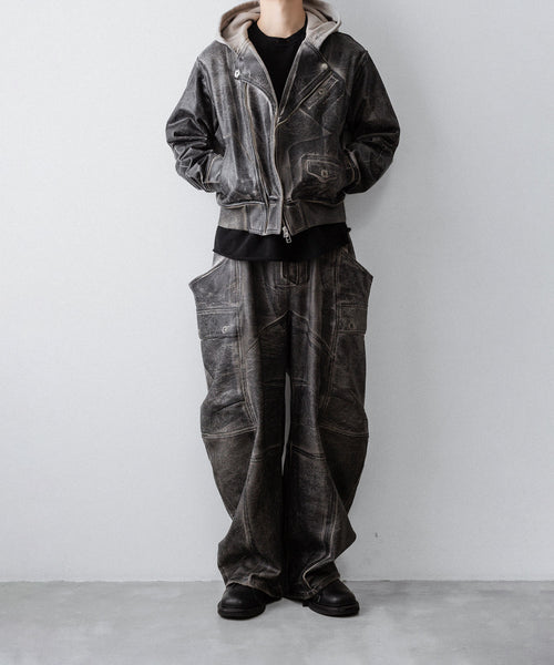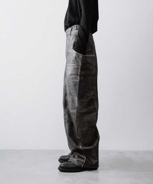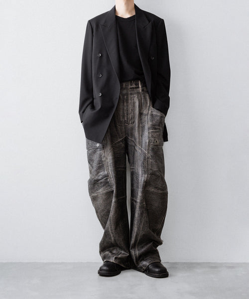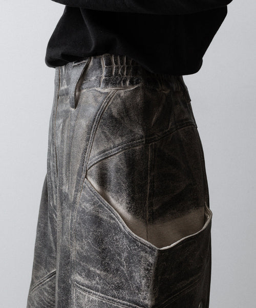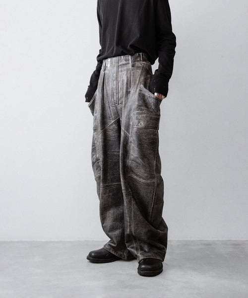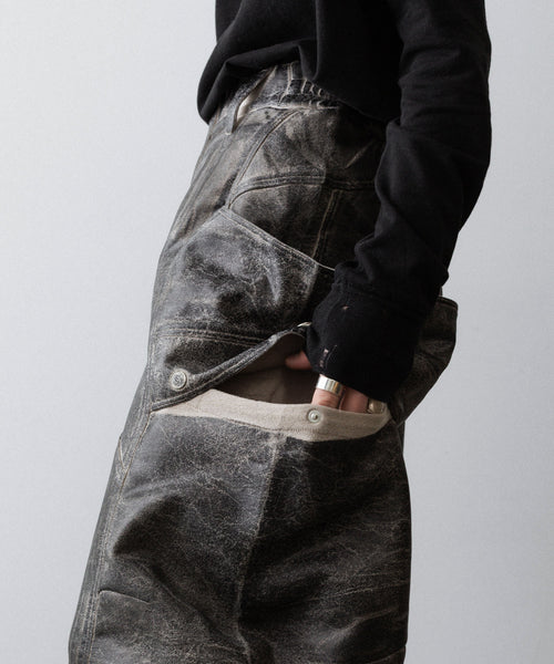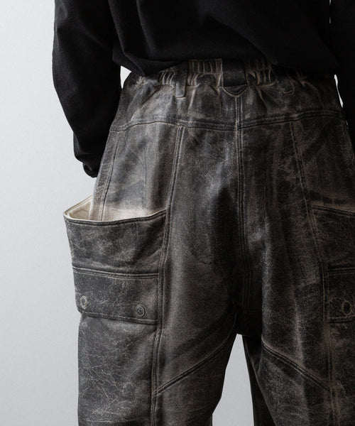国内外のメゾンブランドを手掛ける岡山県のデニム加工工場で、職人の手により1点ずつ本革の古着と見紛うコーティングを施し、使いやすさと雰囲気を兼ね備えた生地に仕上げています