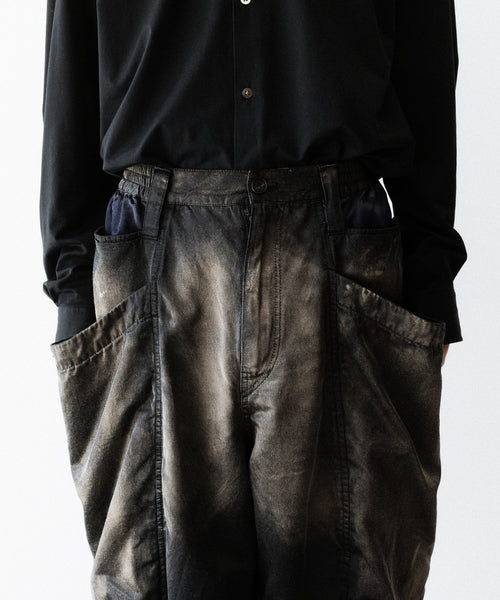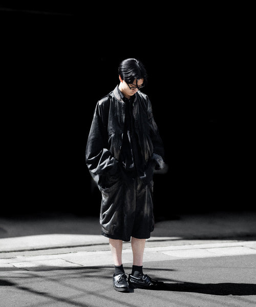 滑らかなサテン生地で縫製し、岡山県のコレクションブランドを数多く手掛ける加工工場で1着ずつ手作業で製品ブリーチ加工を施しています。