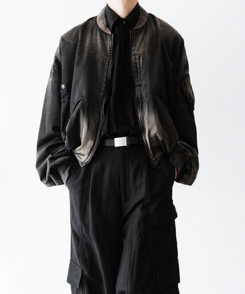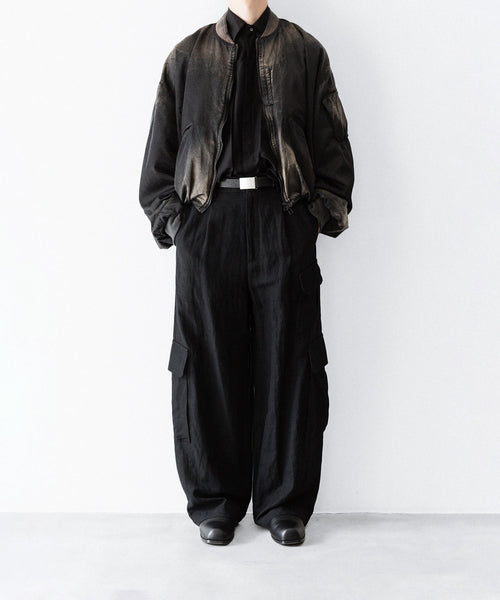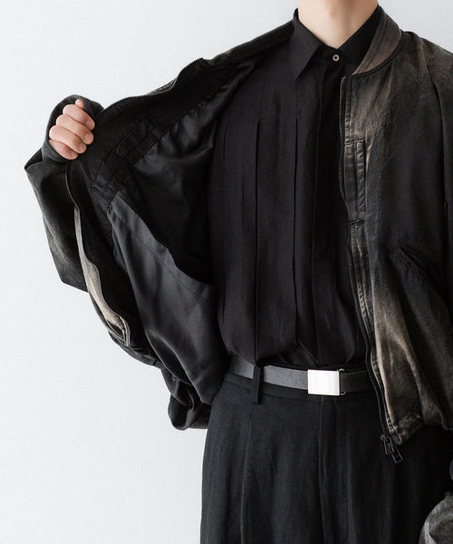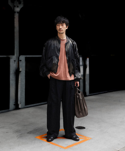 滑らかなサテン生地で縫製し、岡山県のコレクションブランドを数多く手掛ける加工工場で1着ずつ手作業で製品ブリーチ加工を施しています。