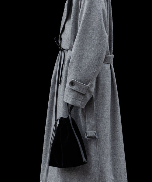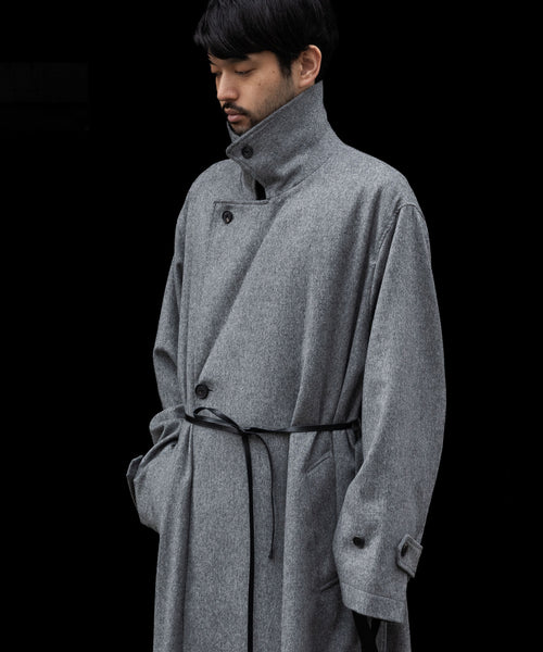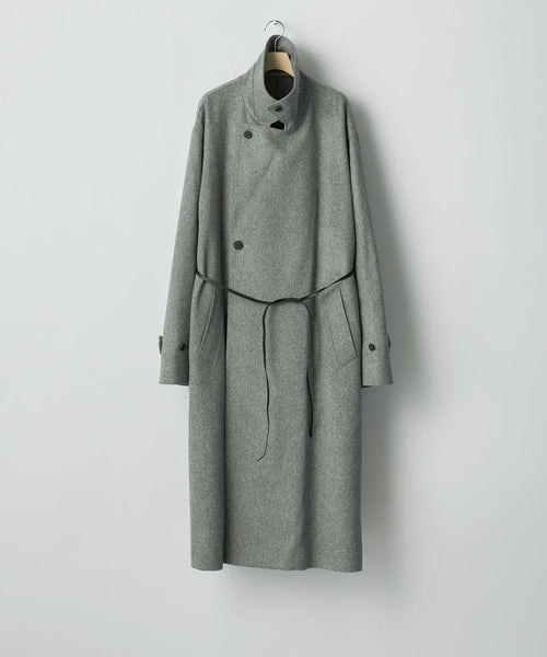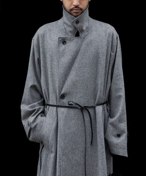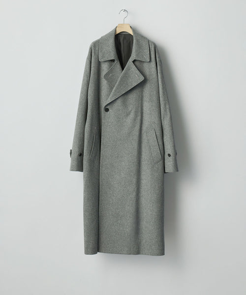 17.5μのジーロンラム原料に内蒙古産のカシミヤをブレンドした混紡糸を極限まで薄く織り、シャルムビーバー加工を施した素材を使用したダブルブレステッドコート。