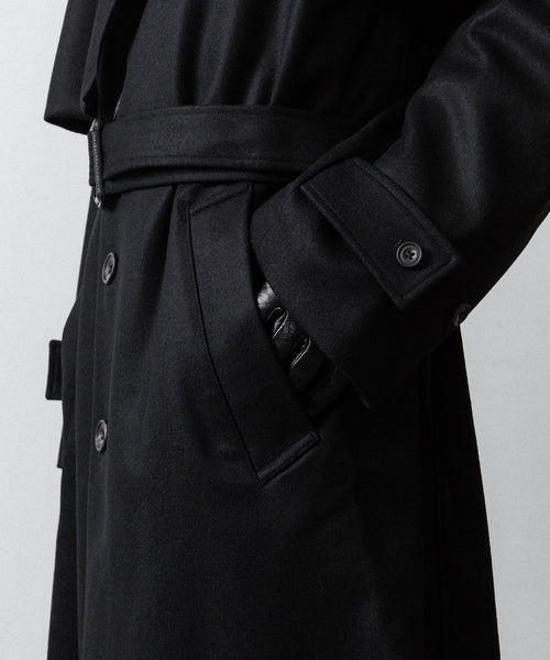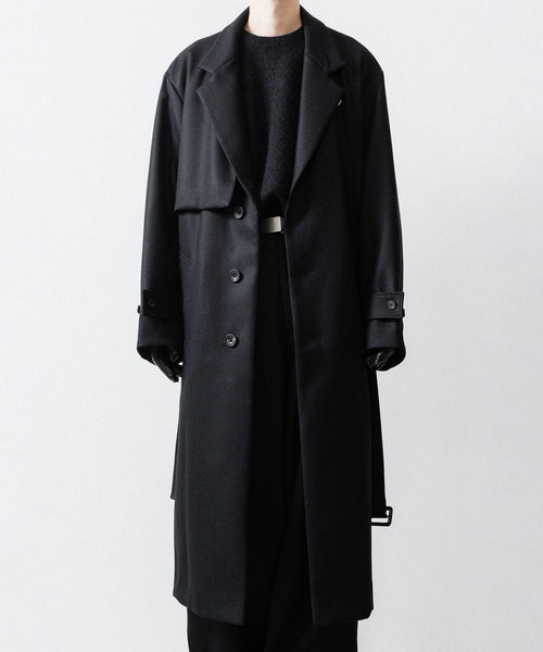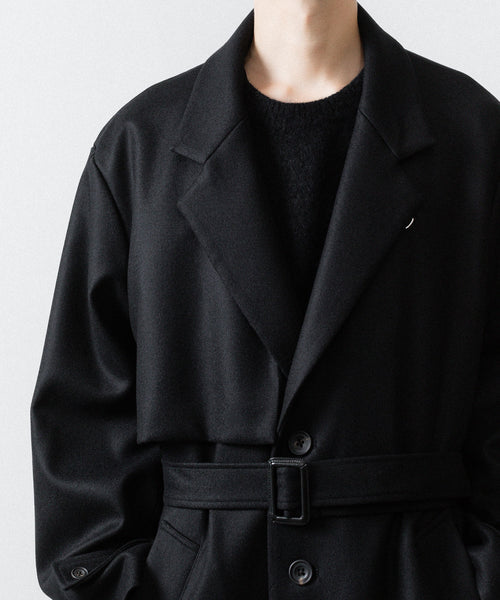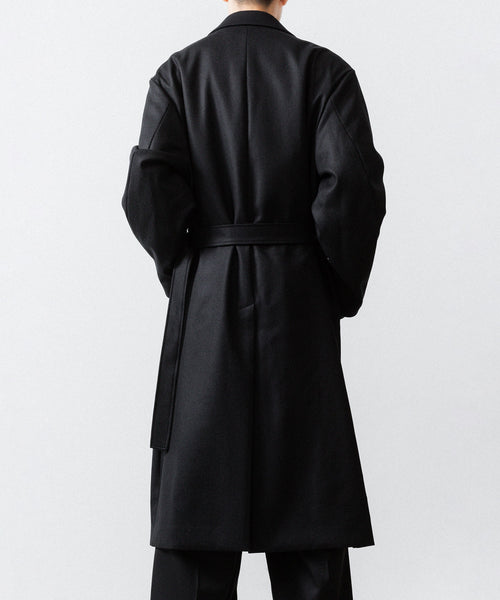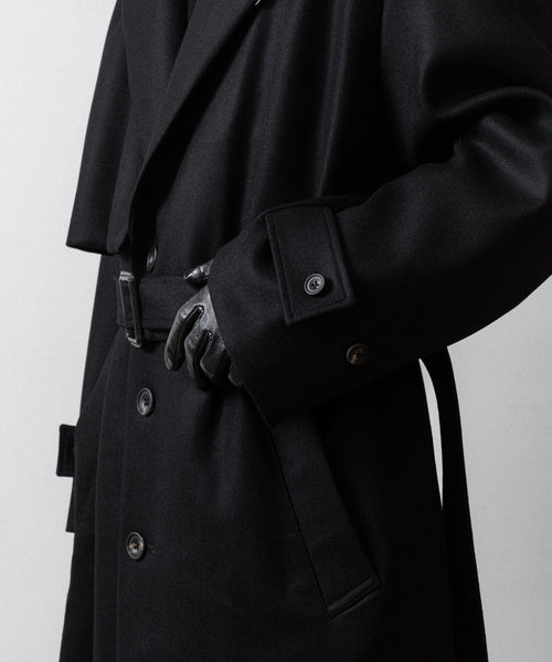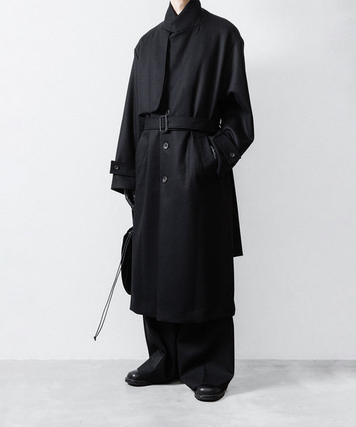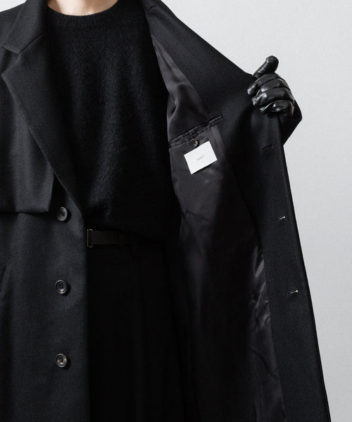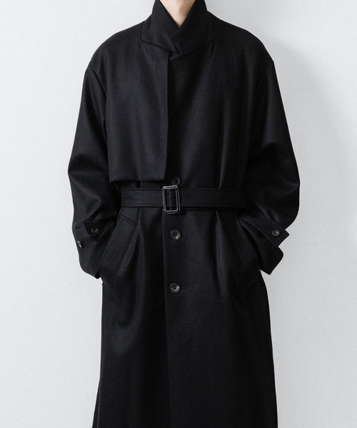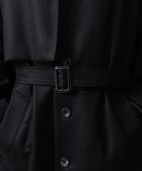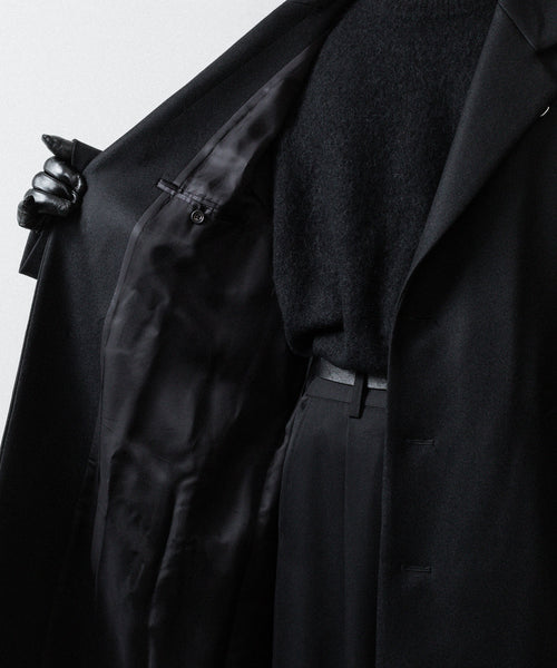 チェスターコートに奥行きをという観点からデザインされたコート。フロント部分のガンフラップ、ガンフラップ下のホック等、ステッチの入らない、生地の重なりのみから成る光と影の出方で奥行きを表現したコート。