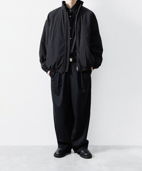 POLYESTER, POLYAMIDE , COTTON混の中厚の素材。 洗い加工をかけ、程良いしわ感を出し、縦にポリエステルを使用することによりカジュアルの面だけでなく上品な光沢感も持ち合わせている。 緯糸に使用しているコットンの繊細な糸の節がさらに生地の表情にアクセントをつけている。