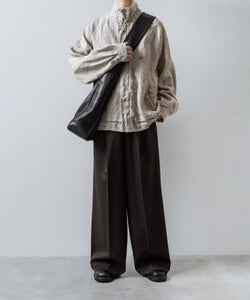 原料は膨らみ感のある太番手である25番単糸のヨーロッパリネンを使用し、尾州産地にてゆっくり丁寧に高密度に織り上げている。 生成りは滋賀の整理工場にてタンブラー加工を施し、ブラックはより深みのある色味にするため京都にて染色からタンブラー加工まで行っている。 適度な肉感があり、高密度であるが見た目に反して柔らかく、落ち感のある生地感が特徴。
