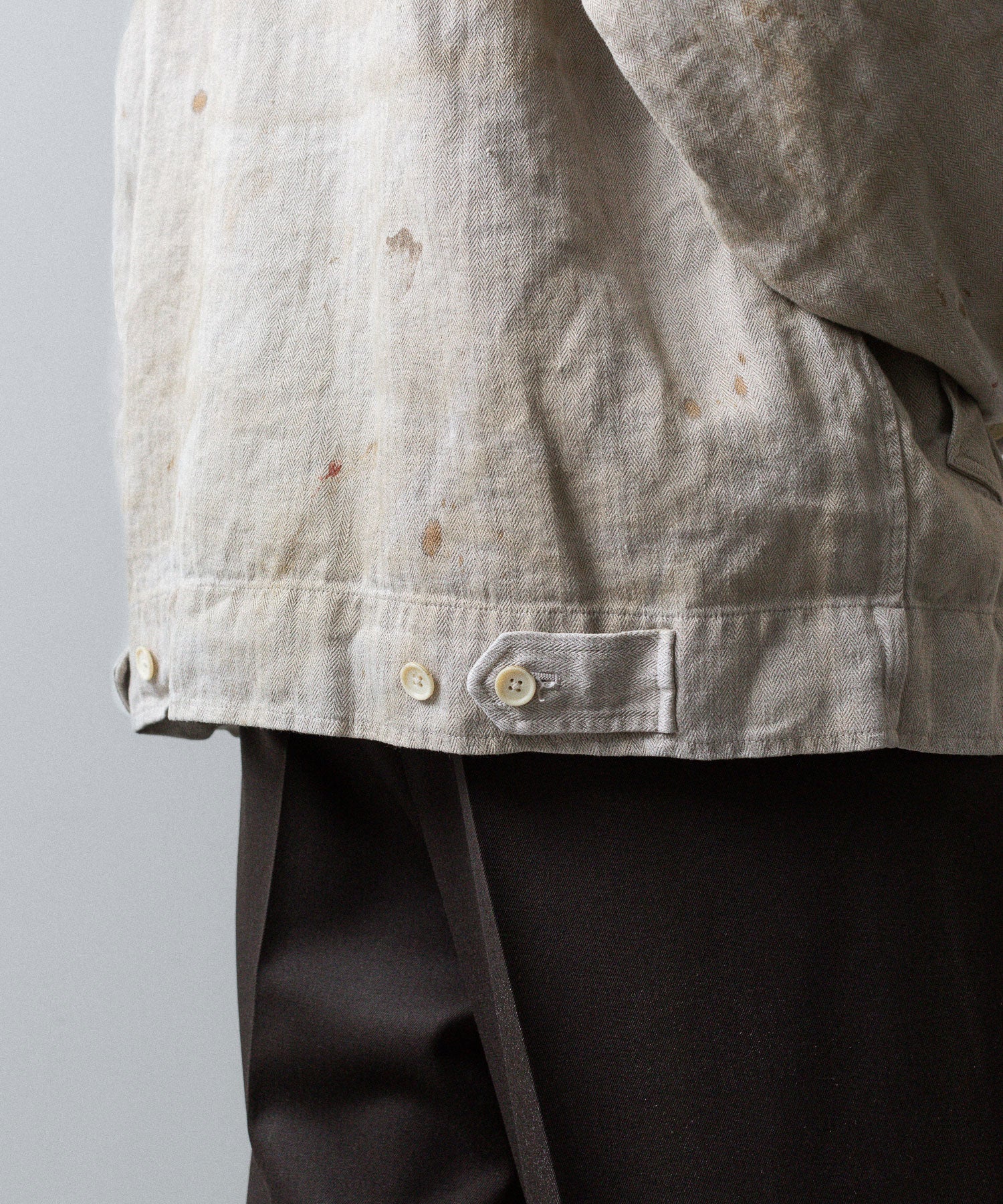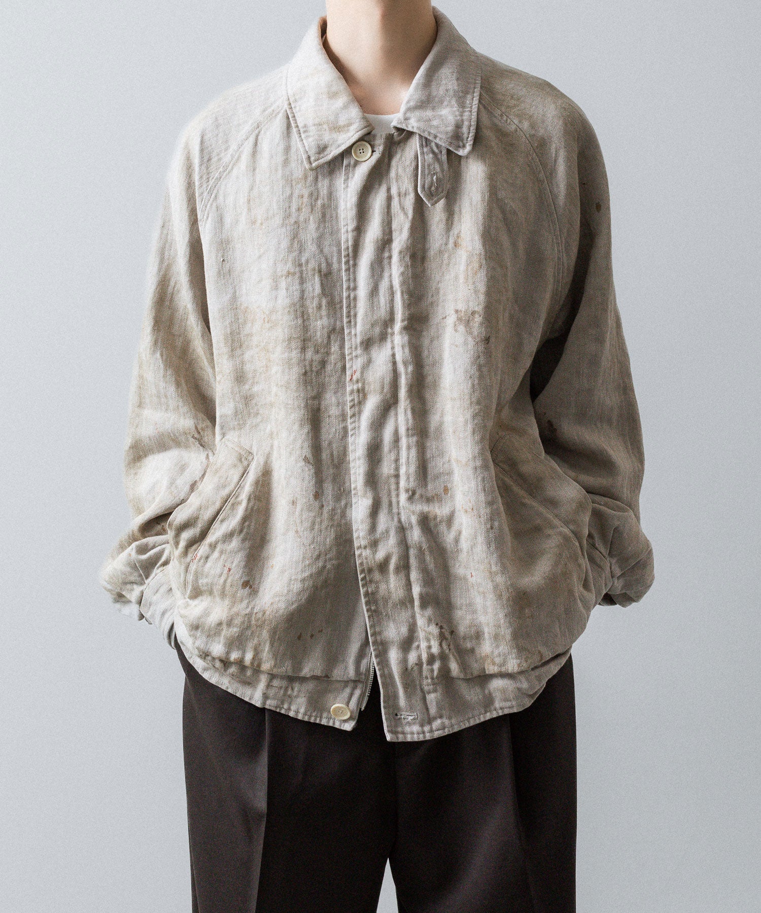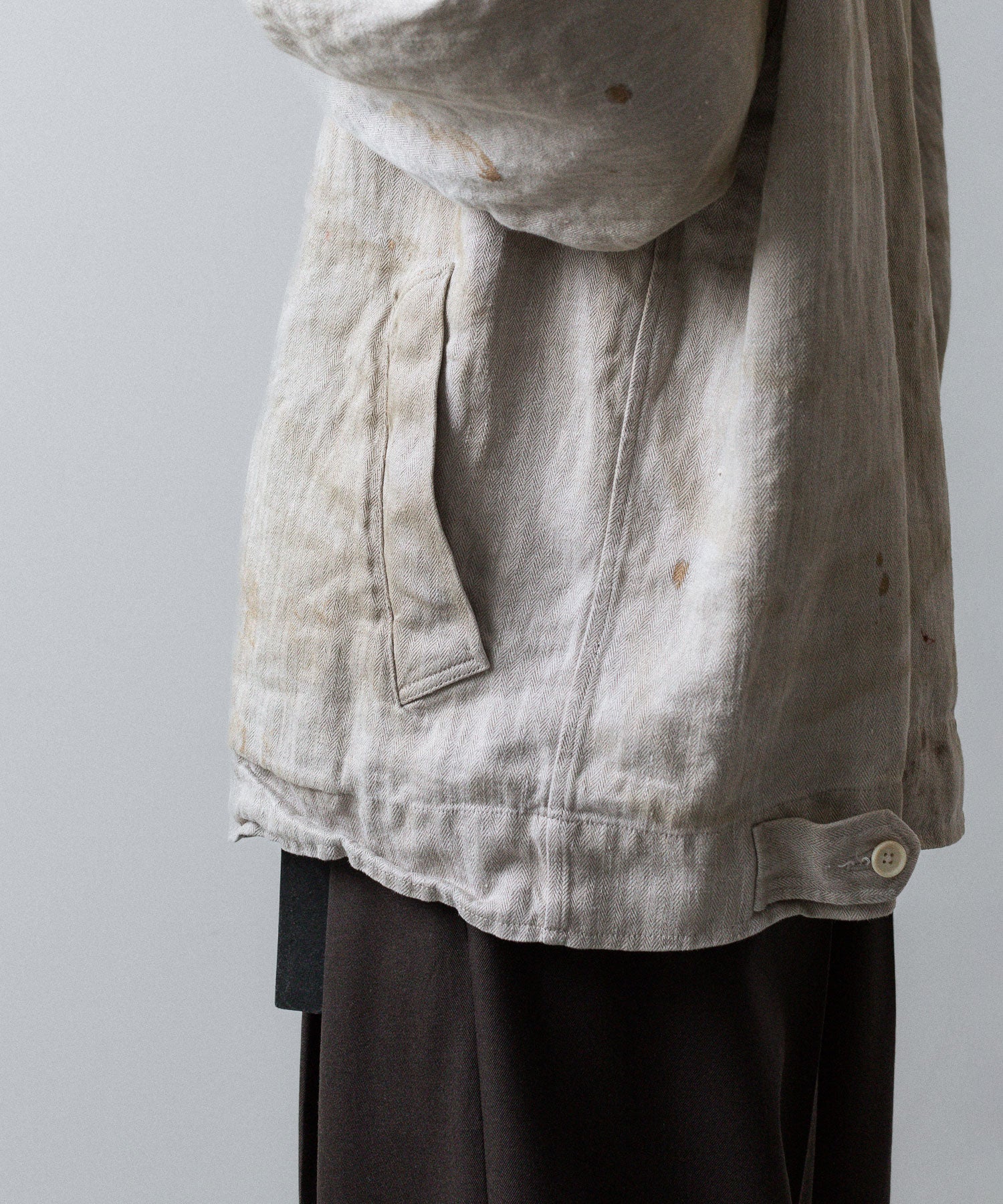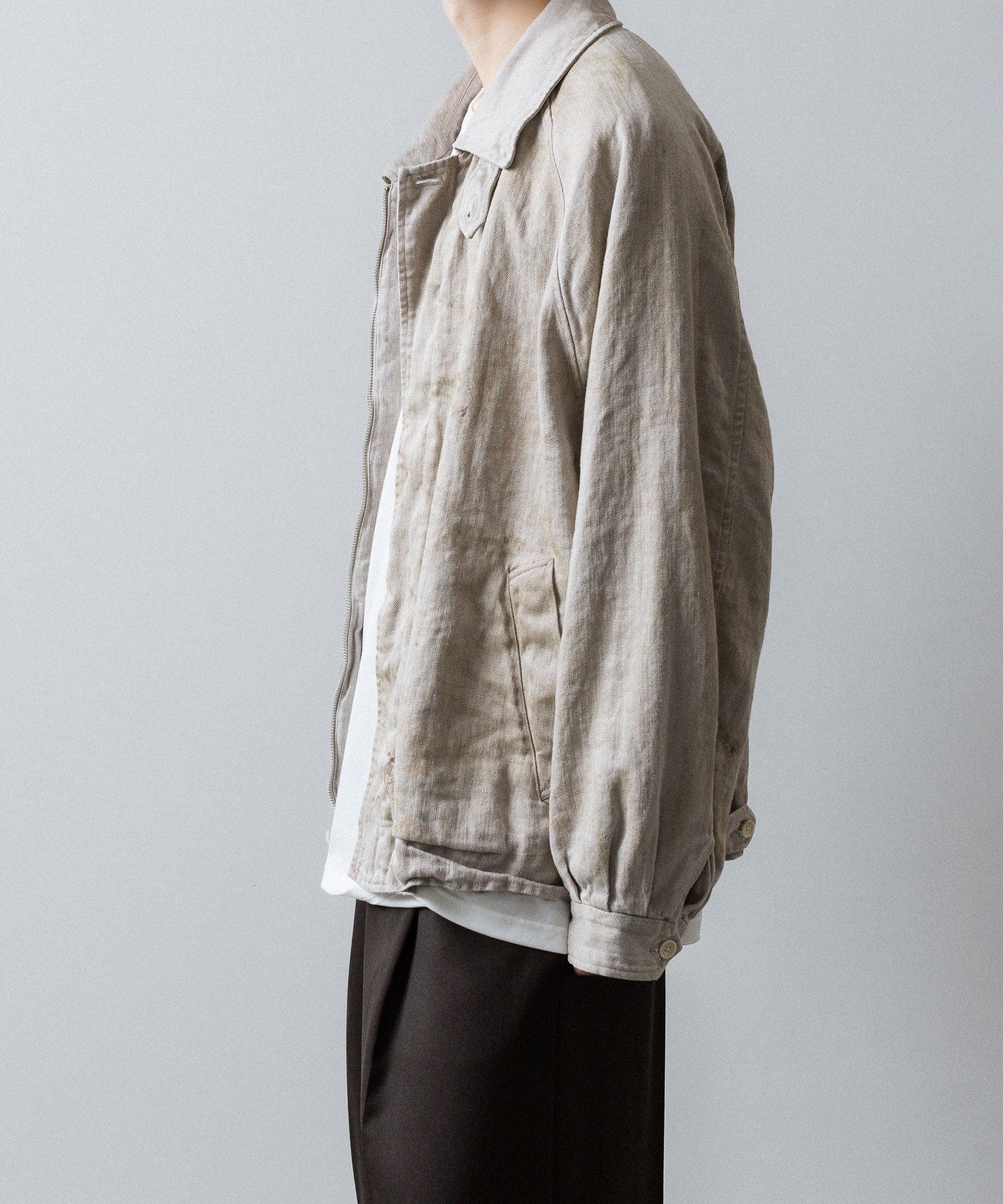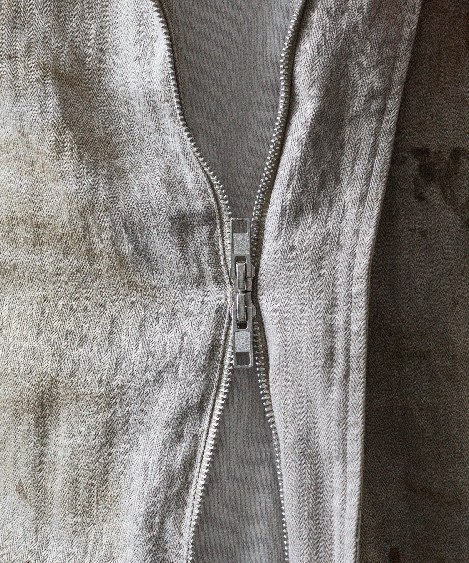 膨らみ感のある25番単糸のヨーロッパリネンを使用し、尾州産地にてゆっくり丁寧に高密度に織り上げたリネンヘリンボーンを使用したジップジャケット。製品洗い、手作業による汚し加工やダメージ等様々な加工を重ねていき、着古したような独特な表情に。