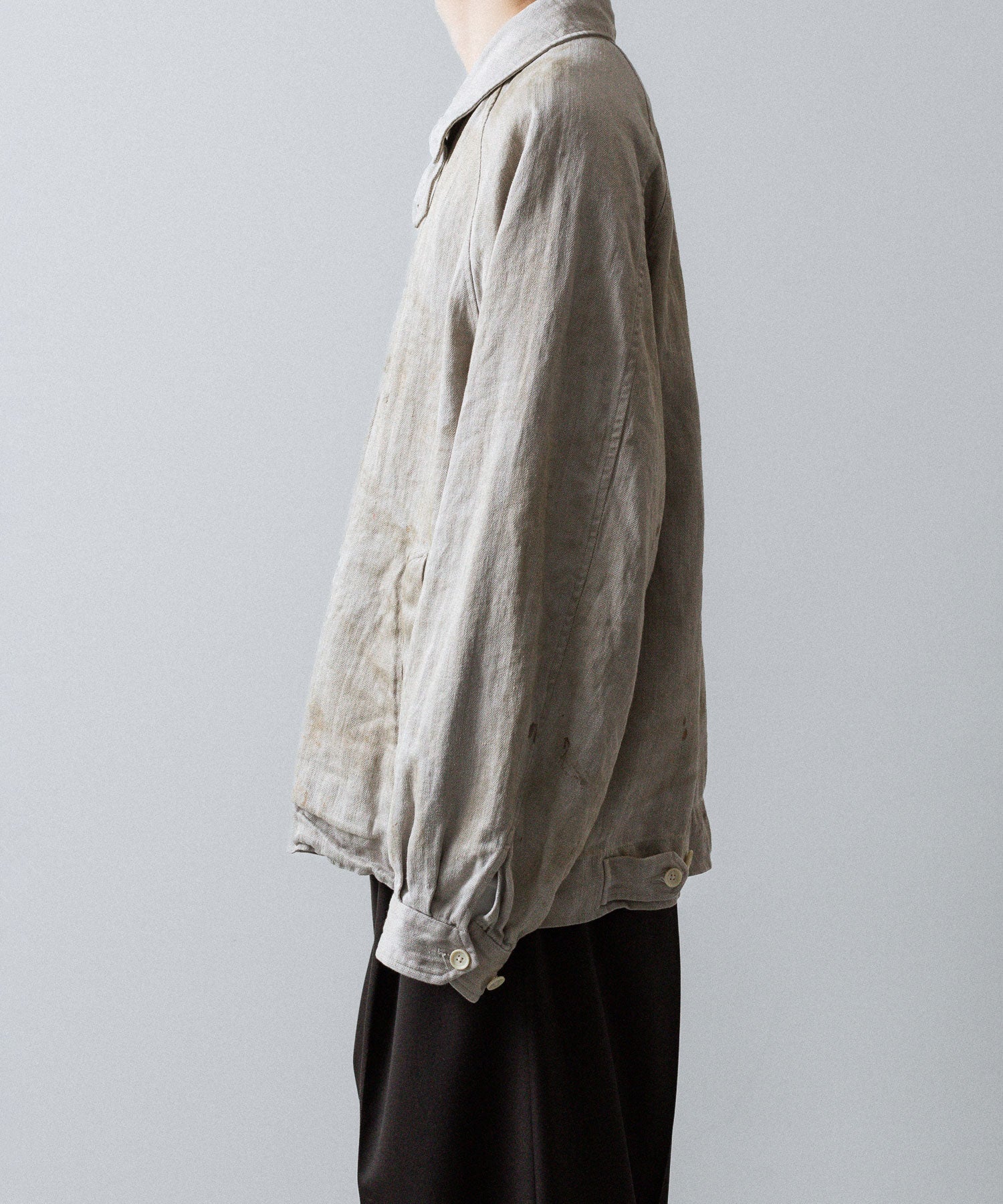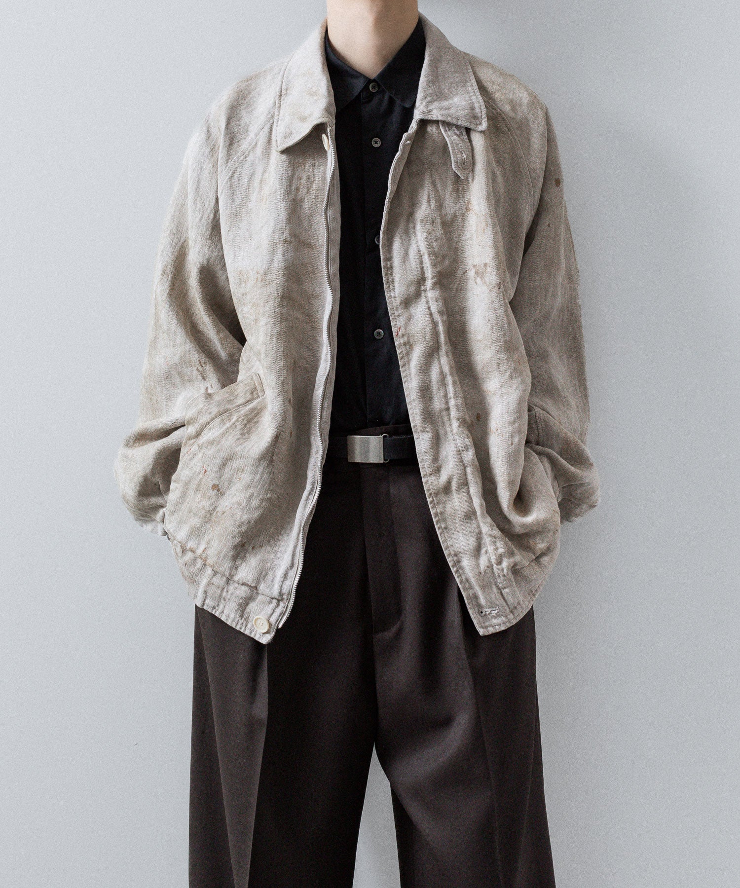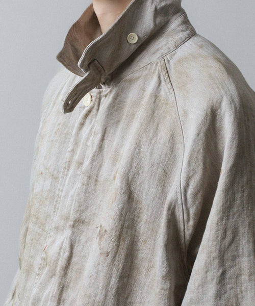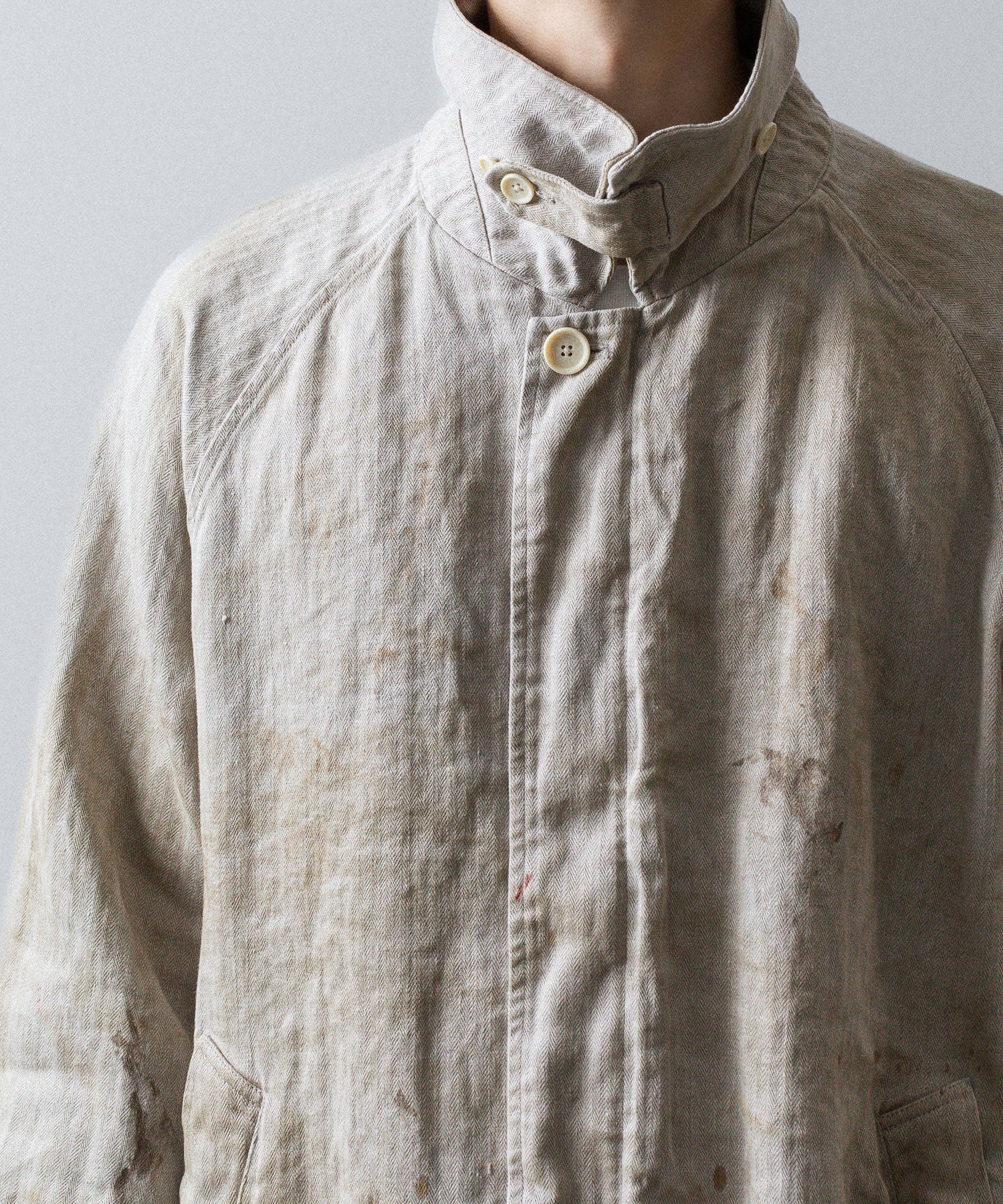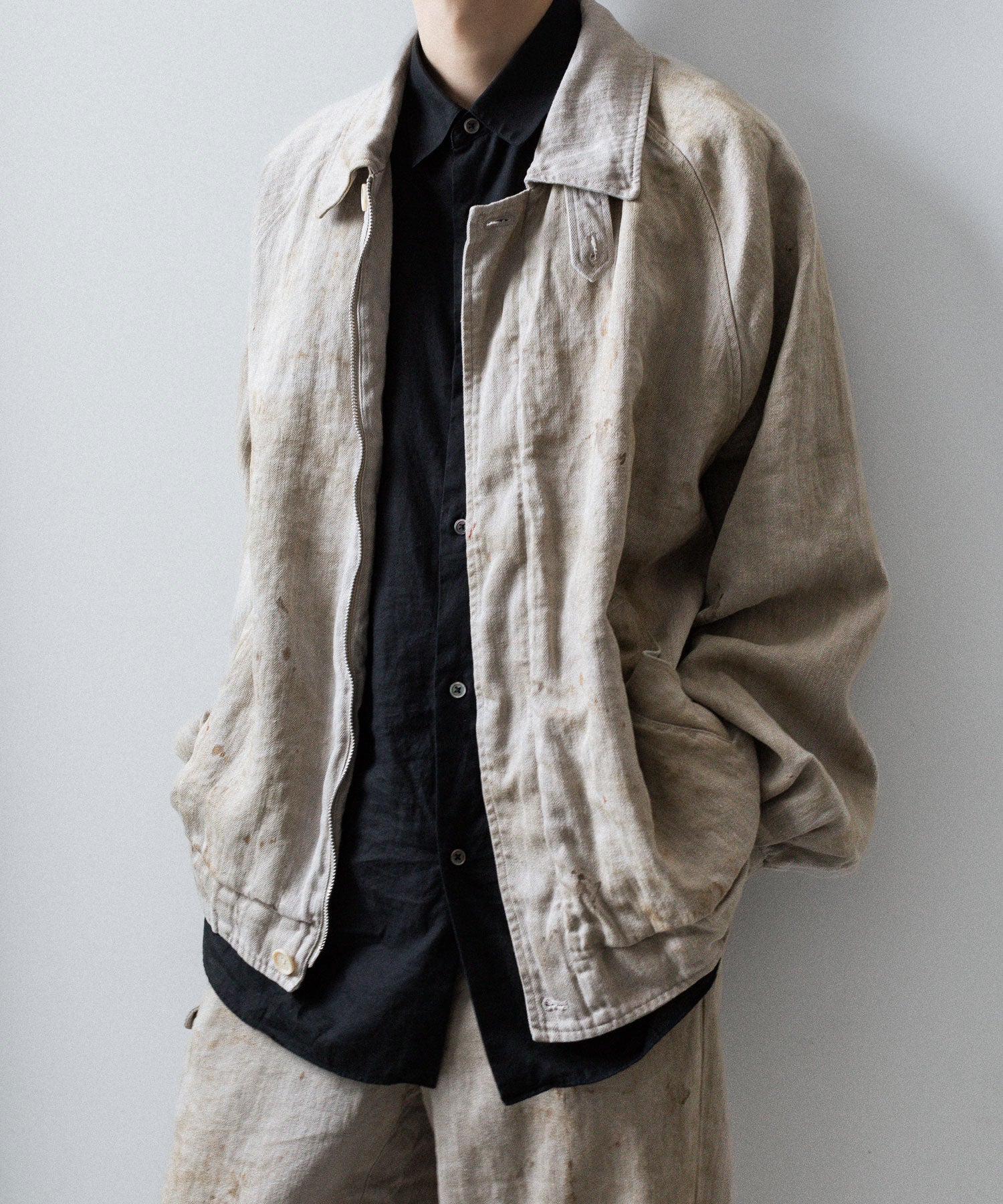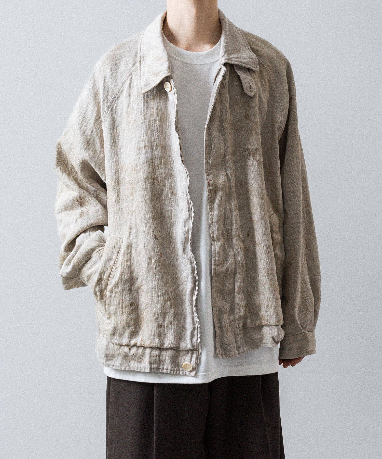 膨らみ感のある25番単糸のヨーロッパリネンを使用し、尾州産地にてゆっくり丁寧に高密度に織り上げたリネンヘリンボーンを使用したジップジャケット。製品洗い、手作業による汚し加工やダメージ等様々な加工を重ねていき、着古したような独特な表情に。