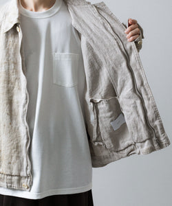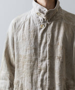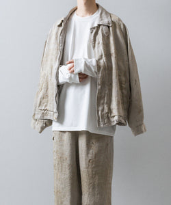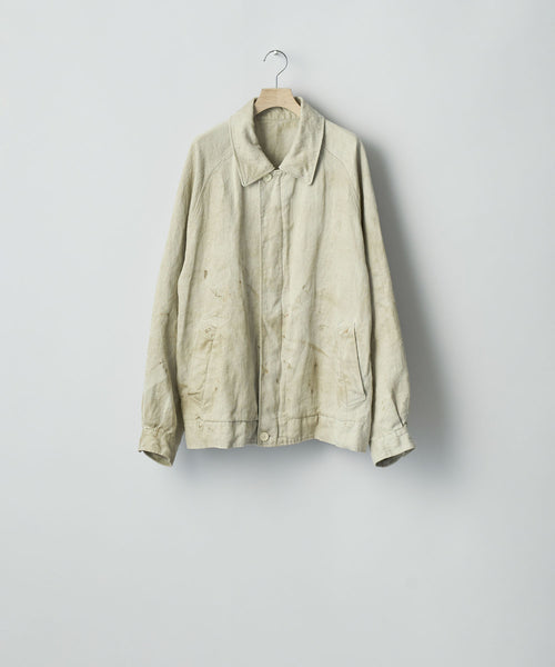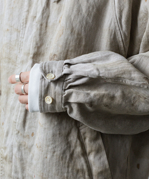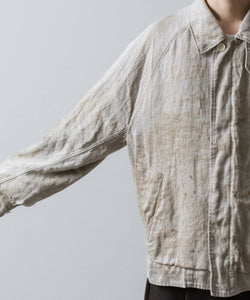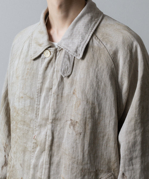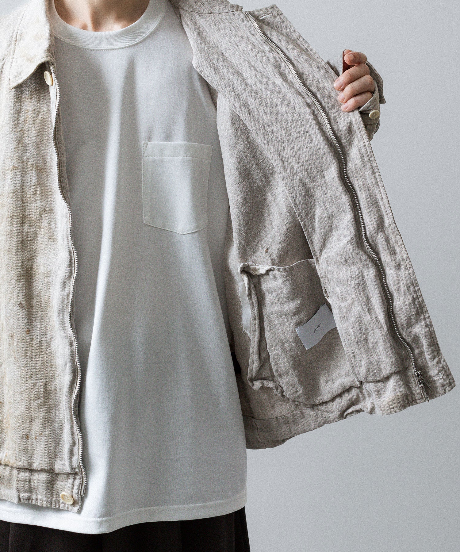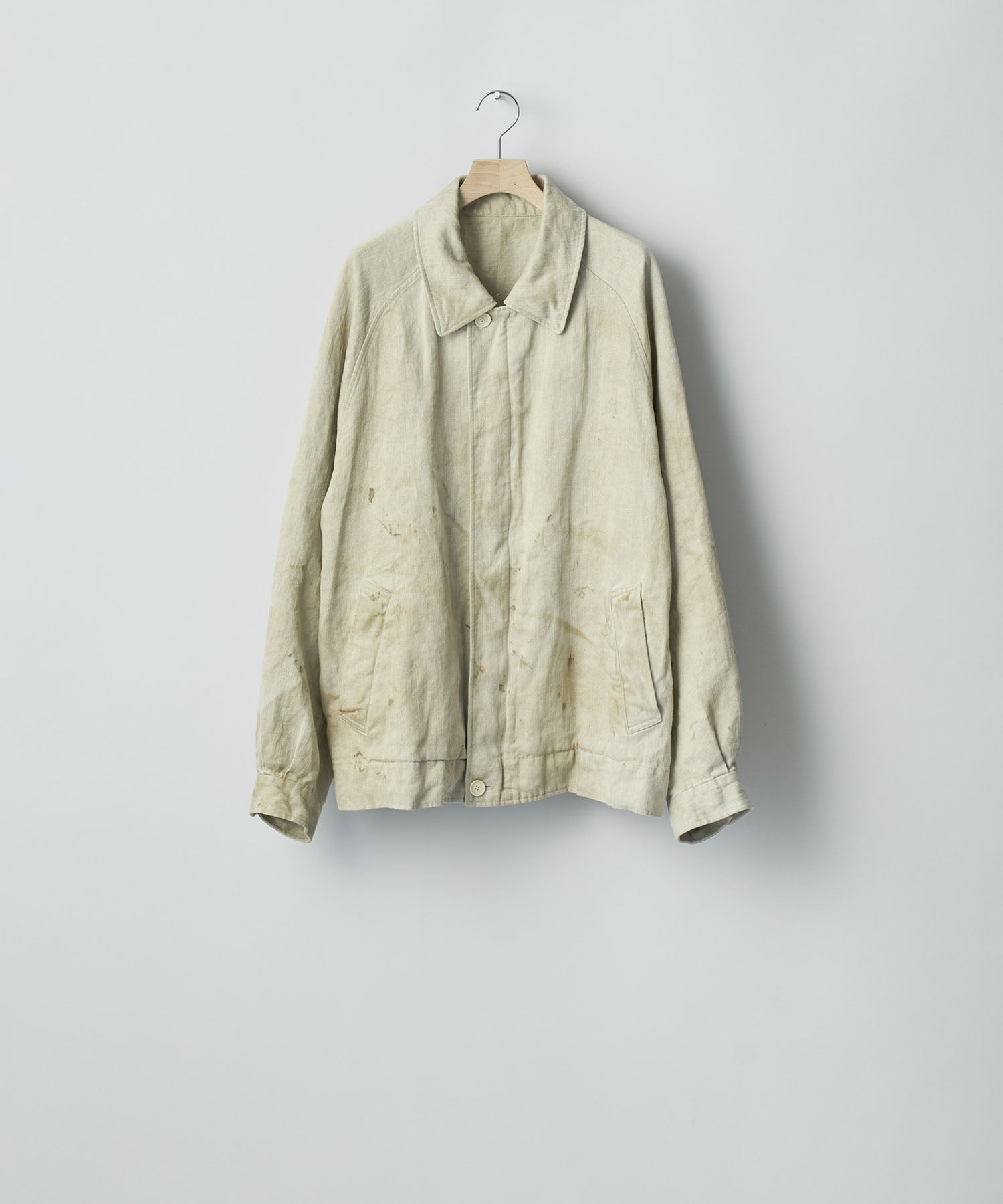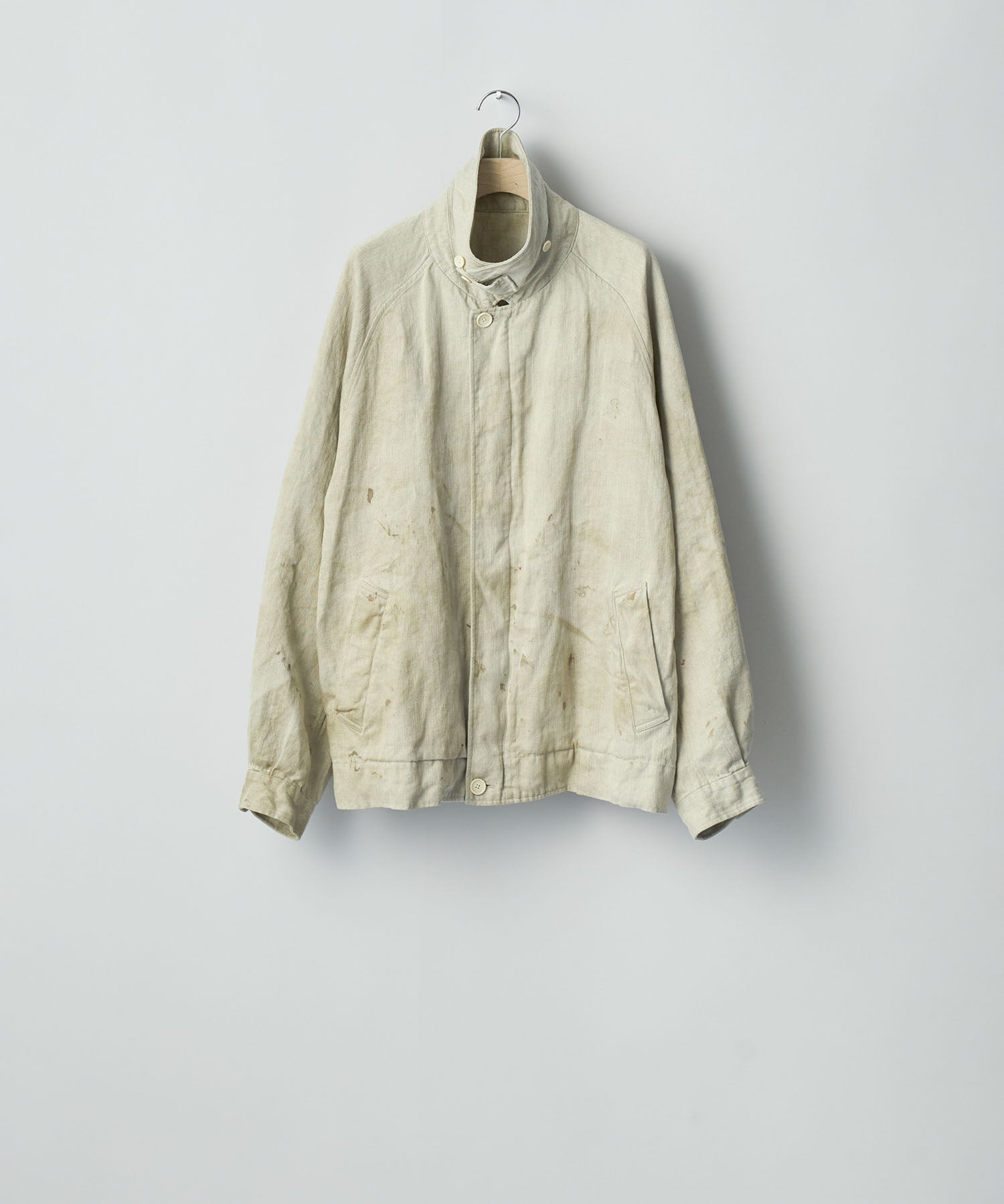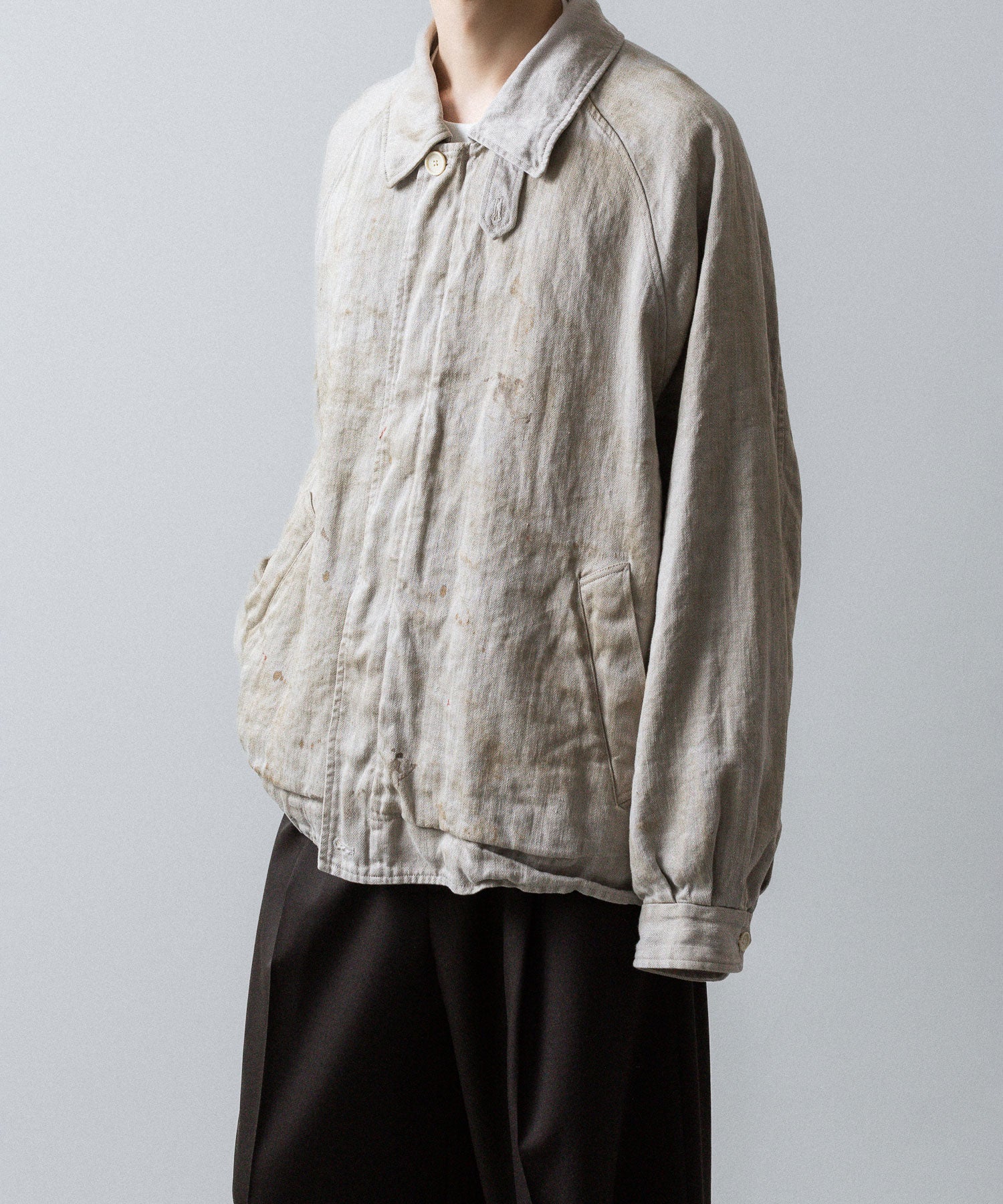 膨らみ感のある25番単糸のヨーロッパリネンを使用し、尾州産地にてゆっくり丁寧に高密度に織り上げたリネンヘリンボーンを使用したジップジャケット。製品洗い、手作業による汚し加工やダメージ等様々な加工を重ねていき、着古したような独特な表情に。