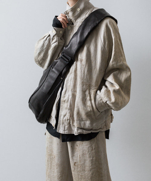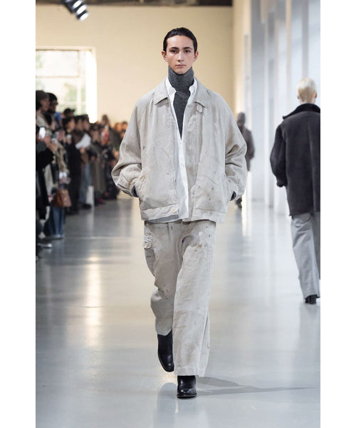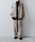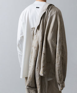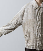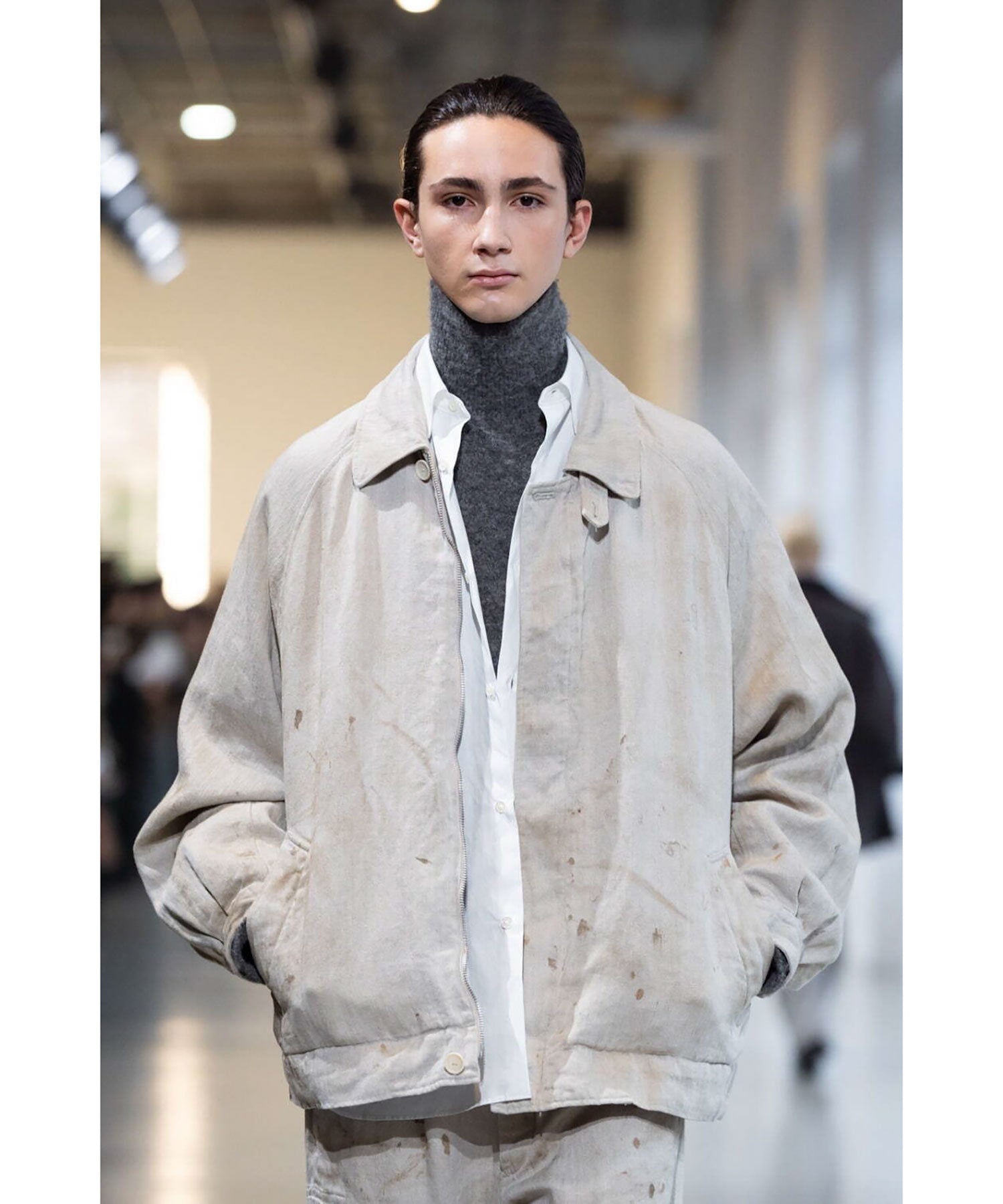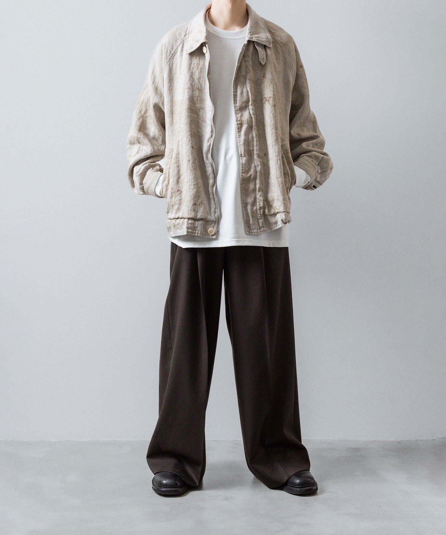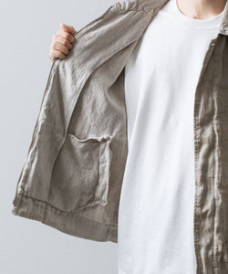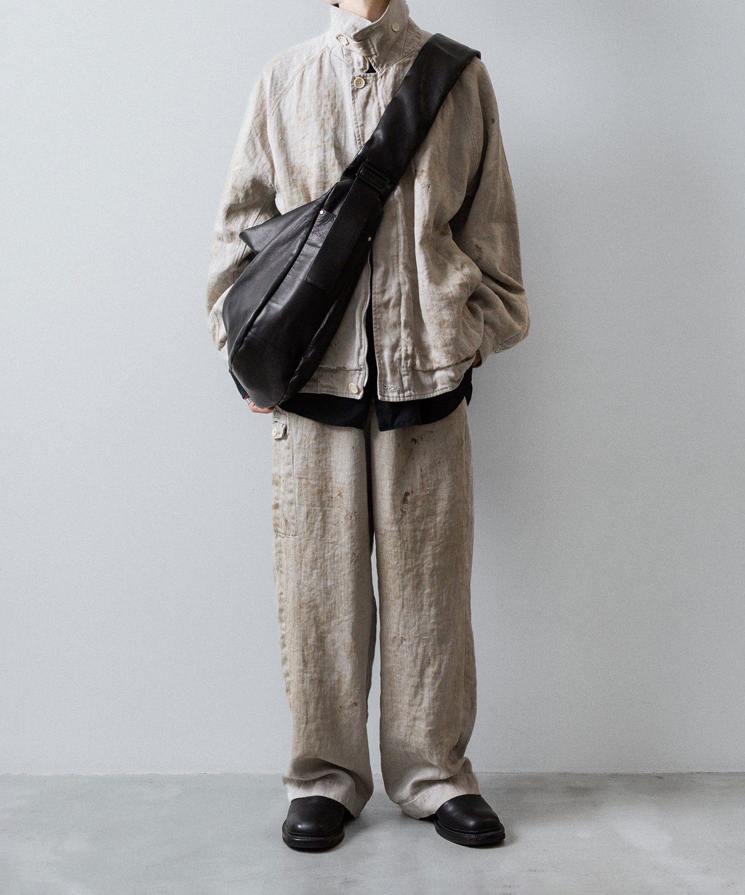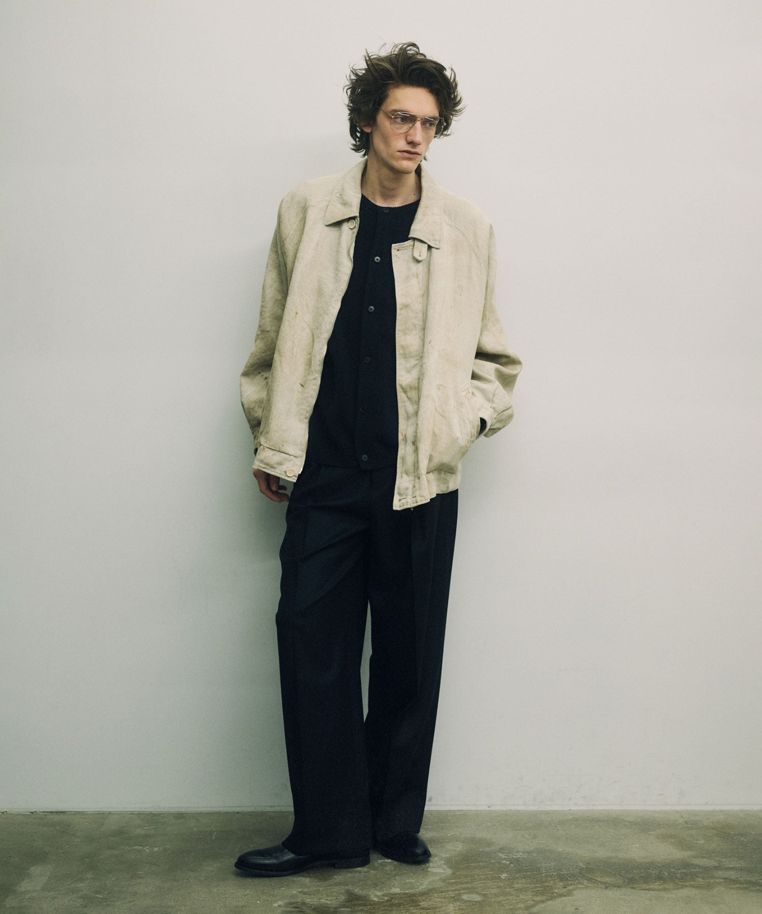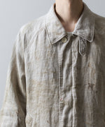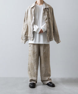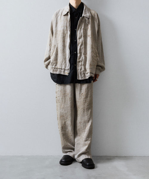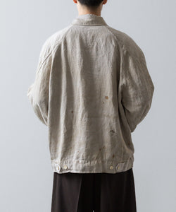 膨らみ感のある25番単糸のヨーロッパリネンを使用し、尾州産地にてゆっくり丁寧に高密度に織り上げたリネンヘリンボーンを使用したジップジャケット。製品洗い、手作業による汚し加工やダメージ等様々な加工を重ねていき、着古したような独特な表情に。