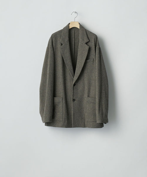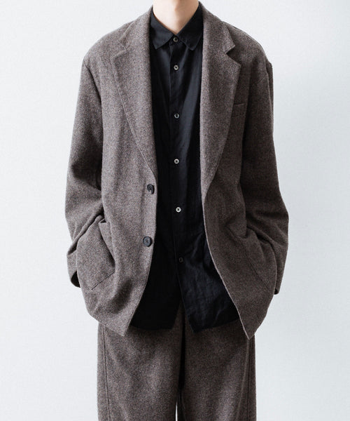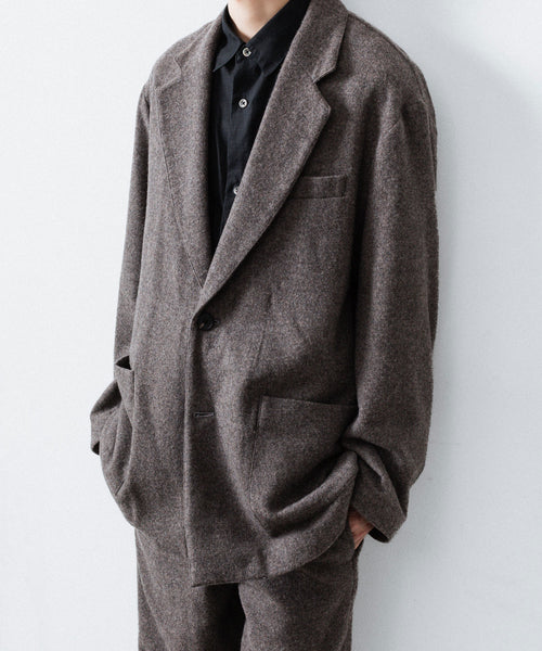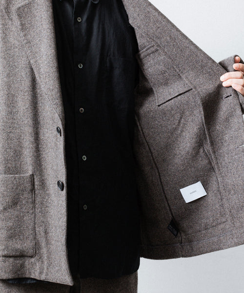 カシミヤの美しい表情とウール特有の膨らみ、弾力性を備えた暖かく優しい風合いが特徴のウールカシミヤフリースで製作した一重のイージー仕様のジャケット。非常に軽く柔らかい着心地が魅力。ジャケットの印象が残るよう肩周りの仕様、ラペル、着丈、袖丈を設定。