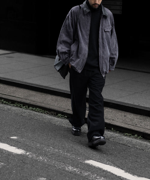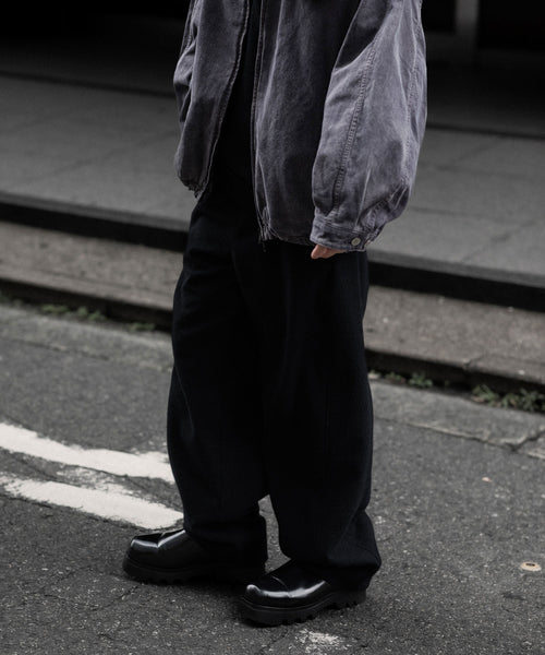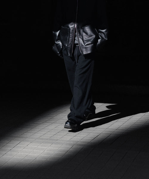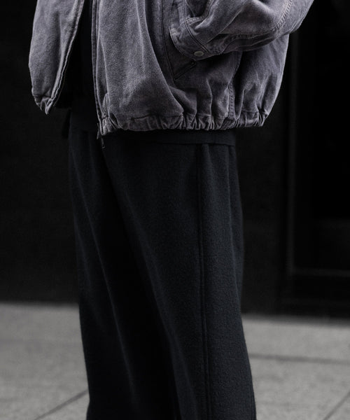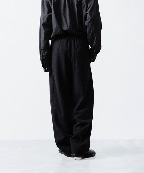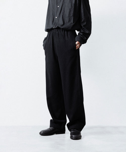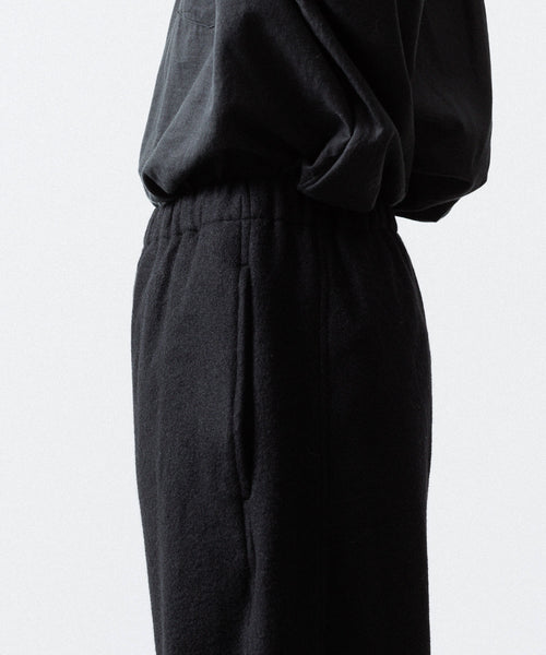 カシミヤの美しい表情とウール特有の膨らみ、弾力性を備えた暖かく優しい風合いが特徴のウールカシミヤフリースで製作したイージートラウザーズ。非常に軽く柔らかい着心地が魅力。脇線をややツイスト気味に設定し、シルエットに少しのニュアンスを入れている。