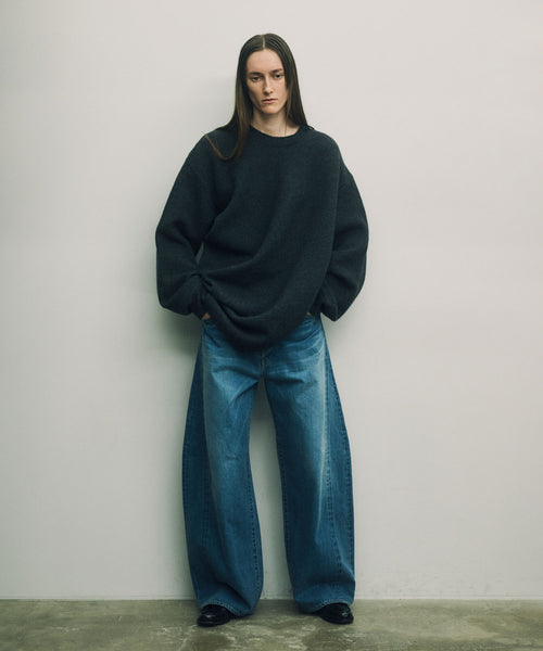 16.5μの特に風合いも柔らかで保温性、保湿性に優れた上質なウールを強縮絨をかけて仕上げた素材のロングスリーブ。片側を長くとり、それをクッションのようにためた独特のシルエットが特徴。強縮絨によるテキスタイルの適度なハリ感、素材感の良さが出る表面の光沢感も魅力。