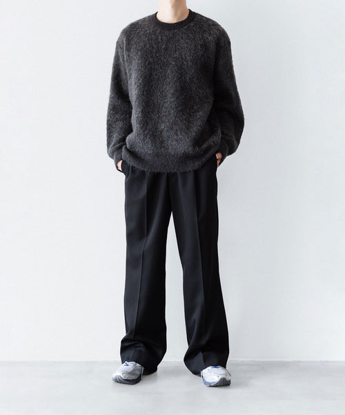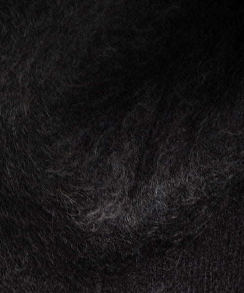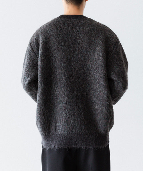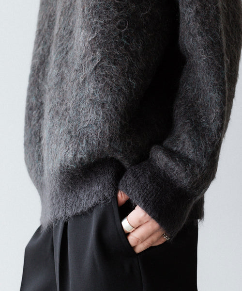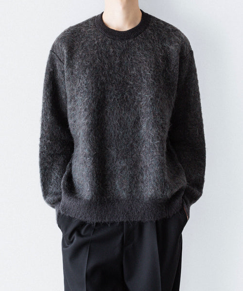モヘアの中でも貴重な滑らかで柔らかな着心地とふくらみのあるキッドモヘアを使用し、5色使用しながらあえて無地でジャカード編みをし、一見単色ながら色味に奥行きを出したクルーネックニットロングスリーブ。起毛加工を施すことで色が混ざり、なんとも言えない深い色合いになっている。