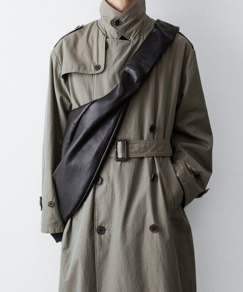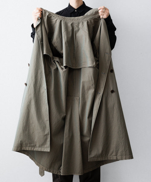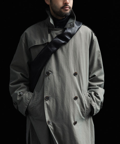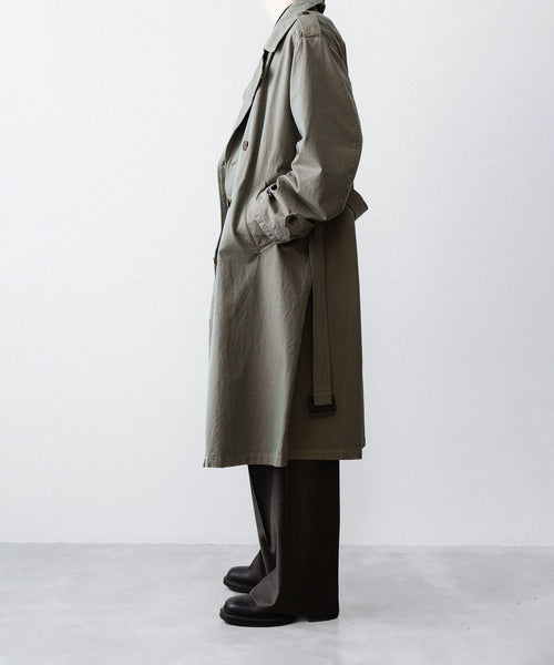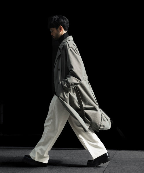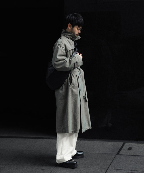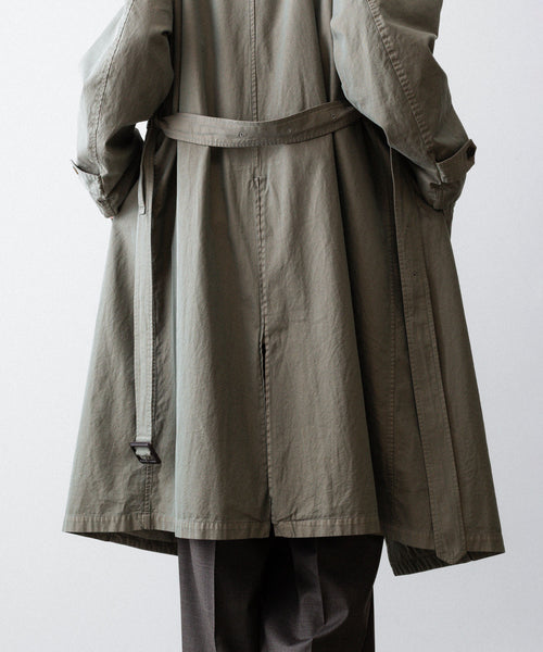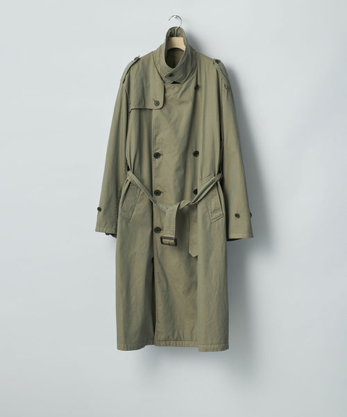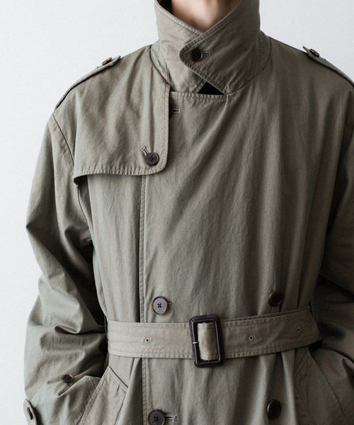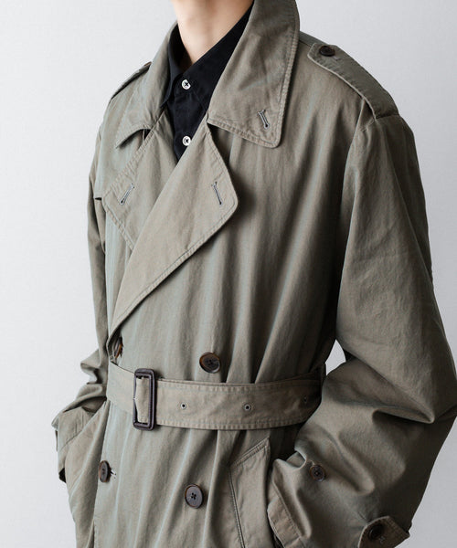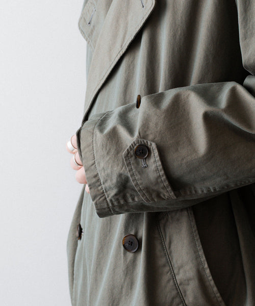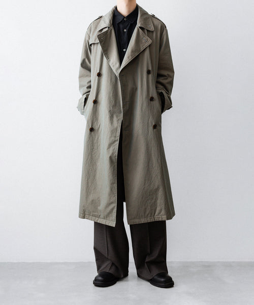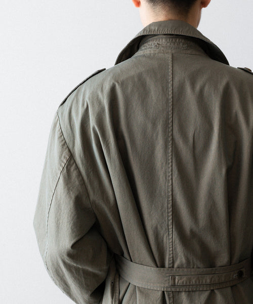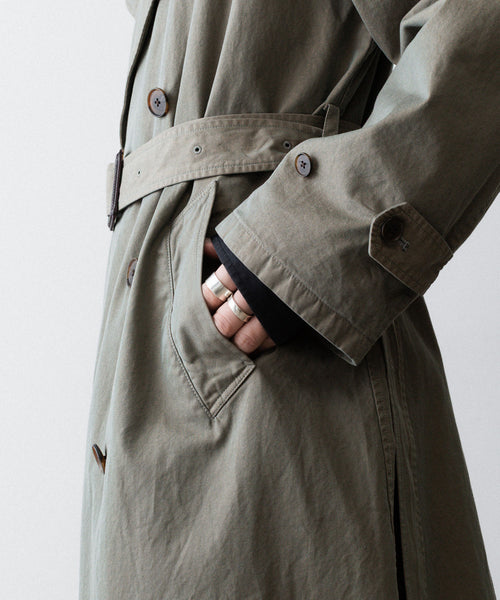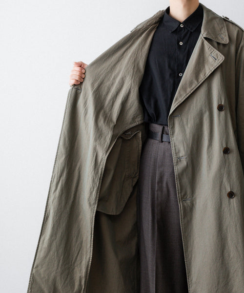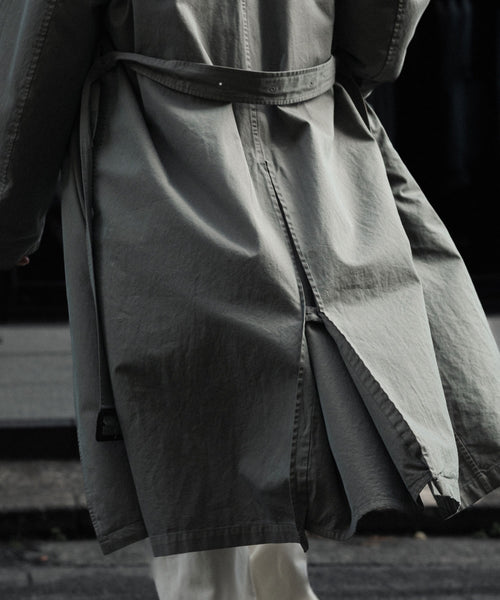 タテ・ヨコ糸共に超長綿のスーピマコットンの60双先染め糸を使用し、高密度に織り上げたギャバジンに撥水加工を施した素材を使用したトレンチコート。 vintageのトレンチコートをベースに全体の表情、各ディテールを調整。 縫製後にボールバイオ、オーバーダイの加工を施し、パッカリング、タマムシの色味にニュアンスを出し、着古したような全体の印象に仕上げている。