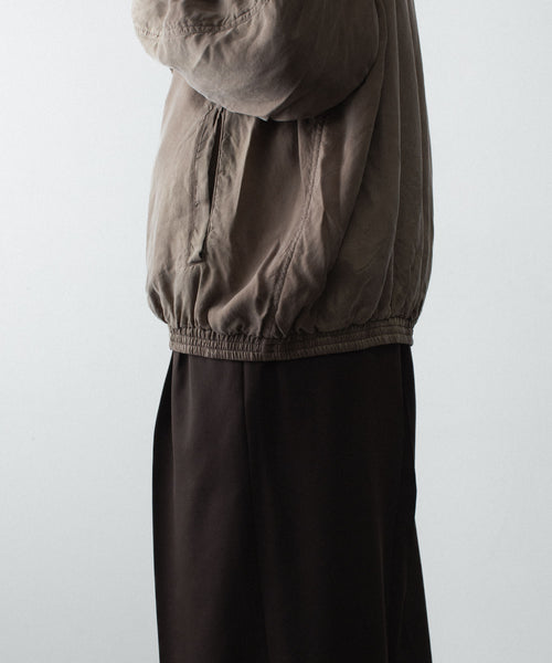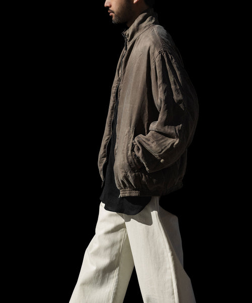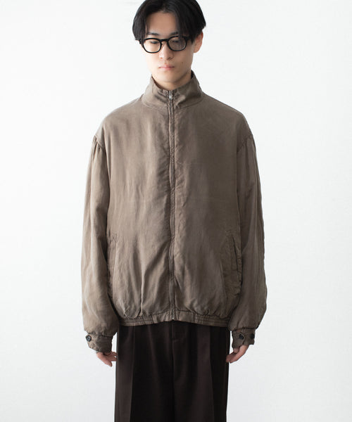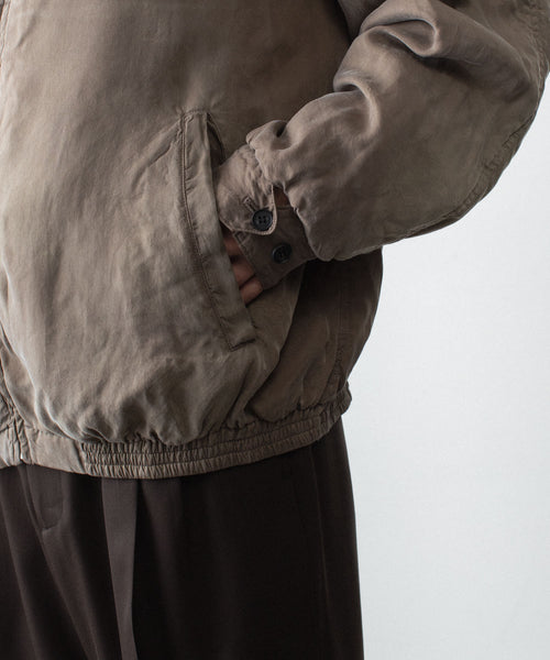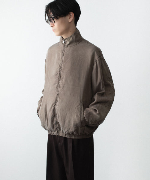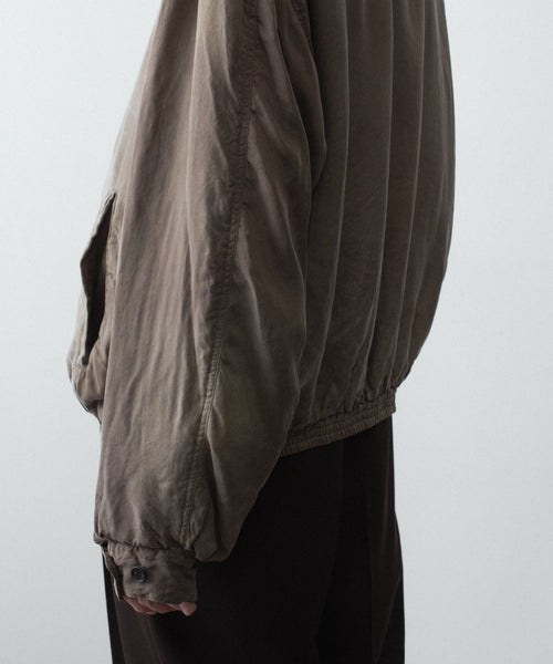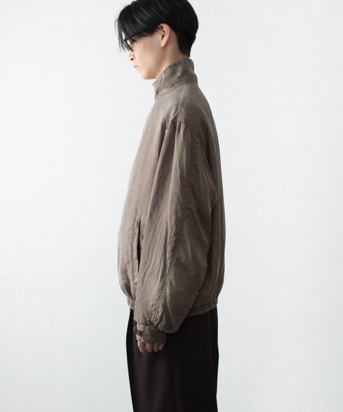 染色の前後2回にフィブリル加工を施しており、表面のヴィンテージ感、キュプラのシルキータッ チと膨らみ感が特徴のツイル地を使用したジップジャケット。 内側は極薄の中綿仕様。ブリーチ、製品洗い、吹付けと加工を重ねていき着古したような奥行きのある表情に仕上げている。 キュプラのシルキーでさらっとした着心地も魅力。