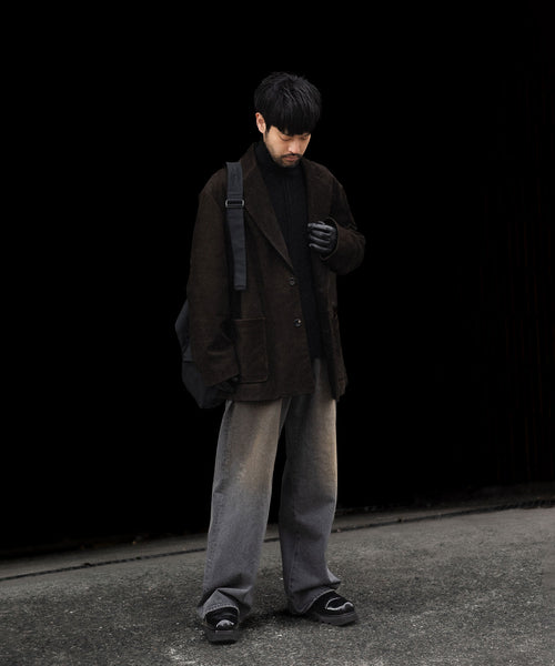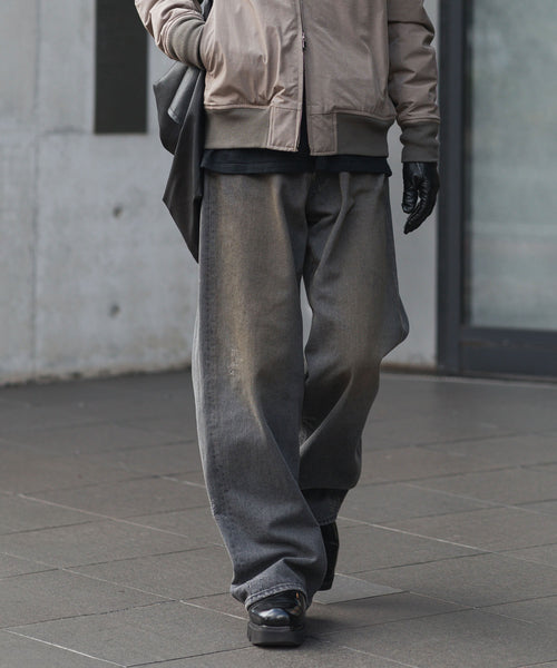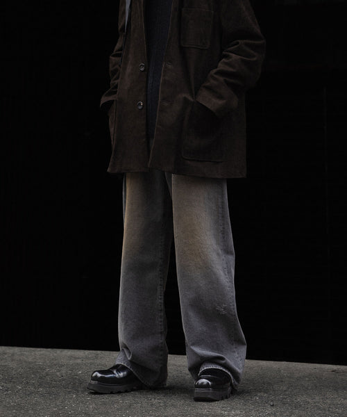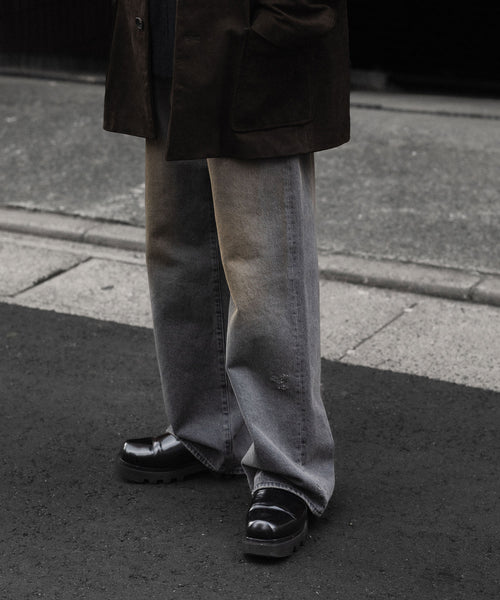 独特の加工感が特徴のストレートデニム。 ストーンウォッシュ、ブリーチ、オーバーダイ、吹付け、手作業によるダメージ感等様々な加工過程を施し奥行きのあるデニムの表情を出している。 シルエットは、股上を浅めに設定したゆったりとしたストレートシルエット。