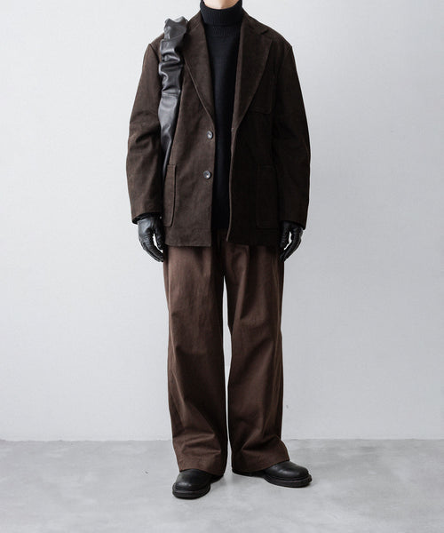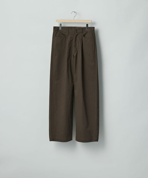 16×10の肉厚チノを微起毛して仕上げた素材を使用したワンタックワイドパンツ。 深めの股上、すっきりめに設定したウエスト周りのバランスがエレガントな印象のワイドストレ ートシルエット。 硫化+微起毛により、洗い込むごとにスエードのような風合いになるのも特徴。