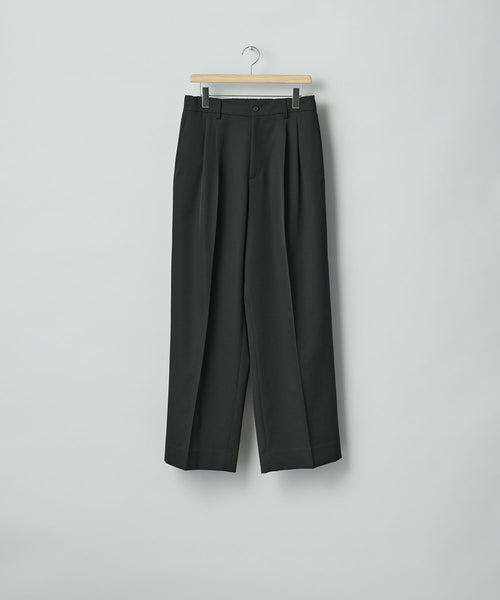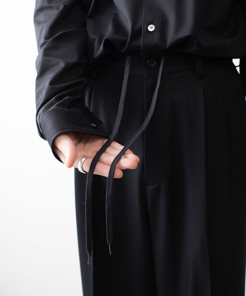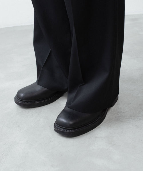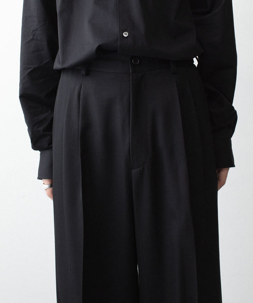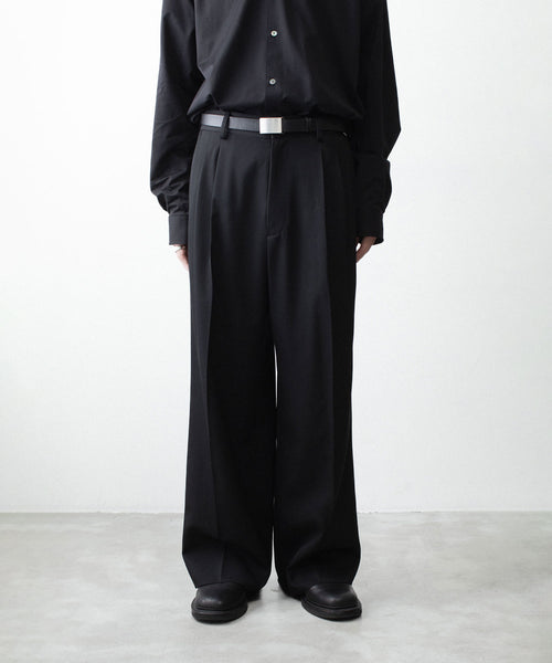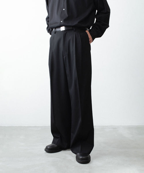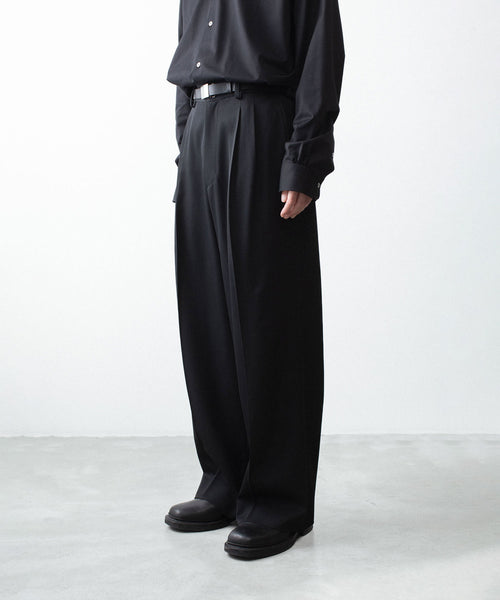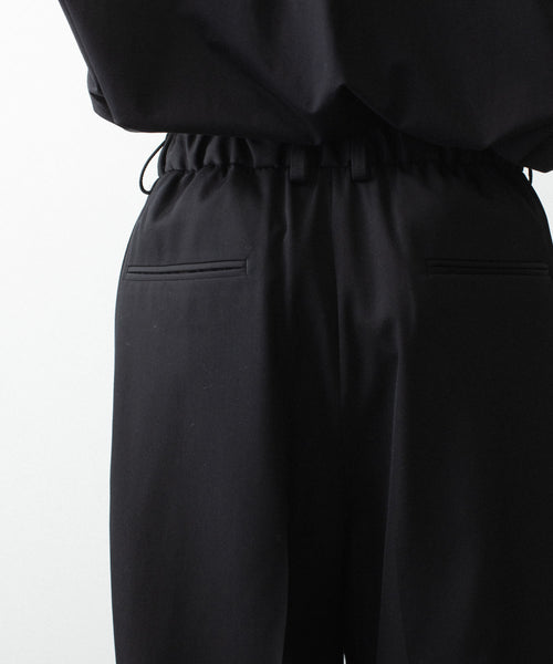 わたり幅から裾幅までワイドに設定したツータックイージートラウザーズ。 イージー仕様のため、様々なウエスト位置でジャストで着用可能。 イージー仕様ながら腰回りはすっきりとしたフィット感になるよう調整し、上品でエレガントな印象に仕上げている。