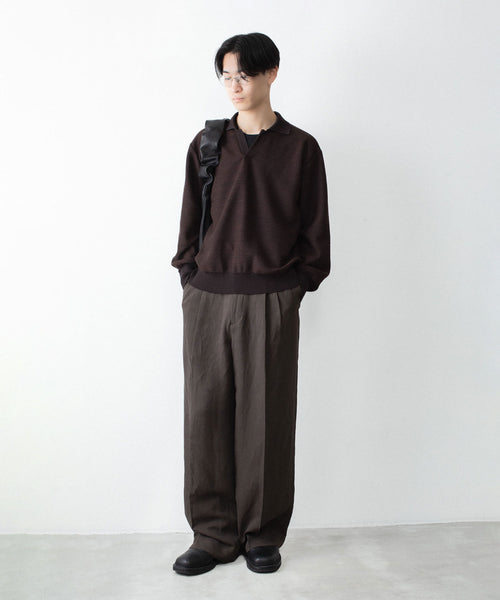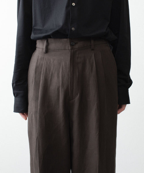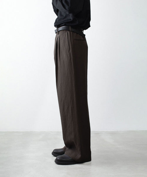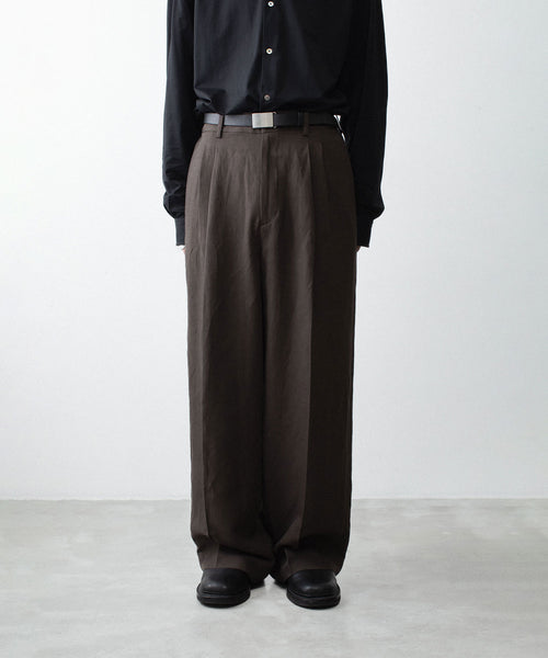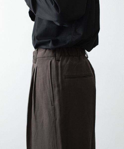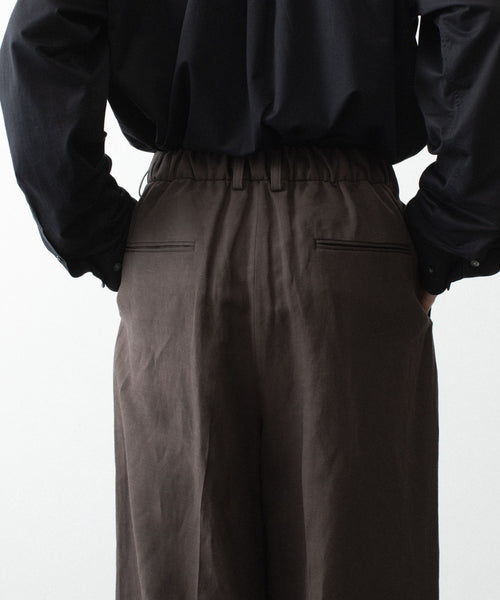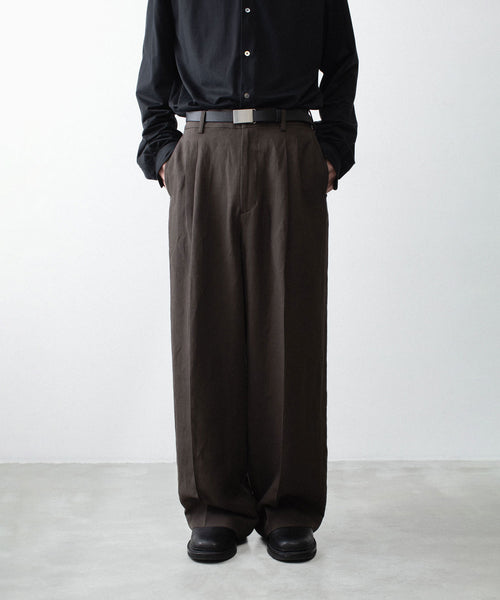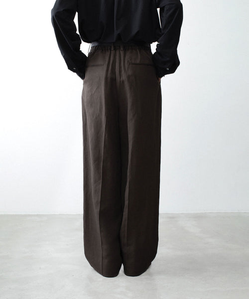 わたり幅から裾幅までワイドに設定したツータックイージートラウザーズ。 イージー仕様のため、様々なウエスト位置でジャストで着用可能。 イージー仕様ながら腰回りはすっきりとしたフィット感になるよう調整し、上品でエレガントな印象に仕上げている。