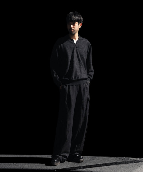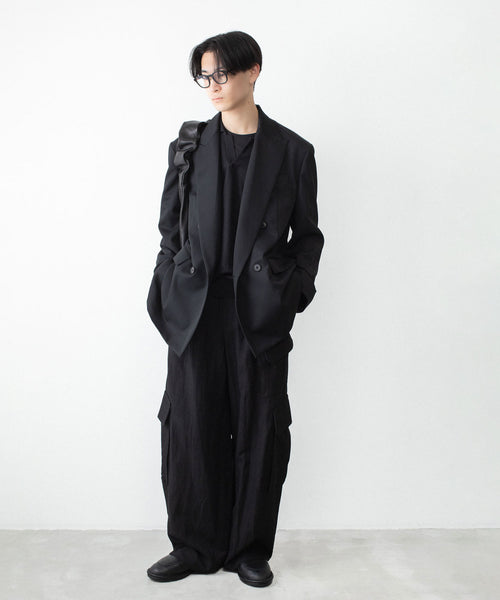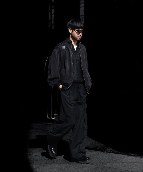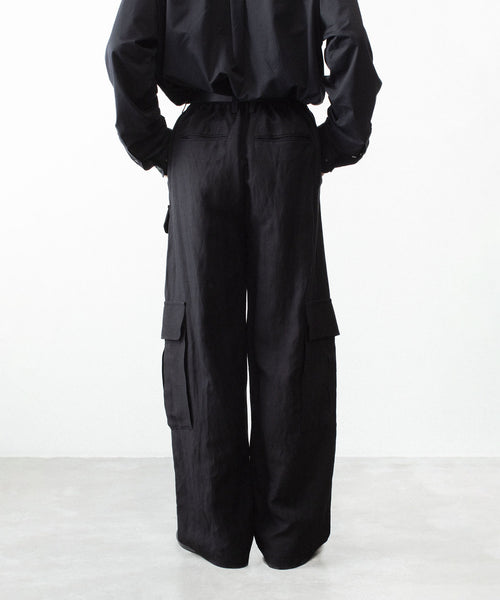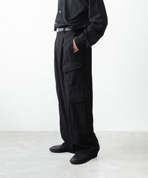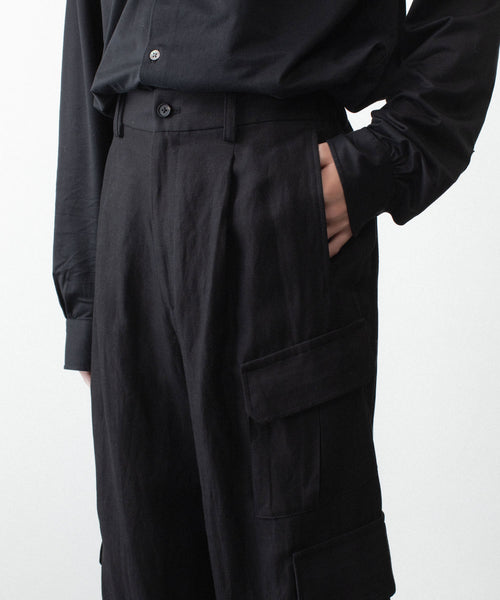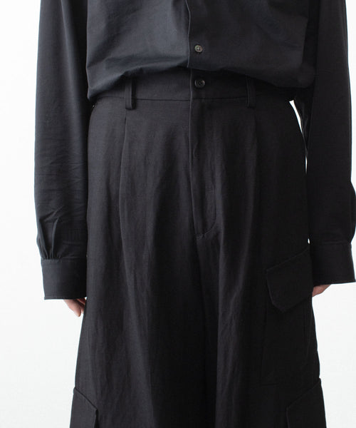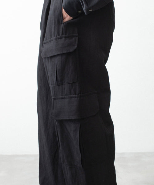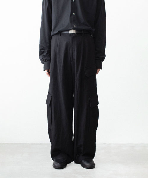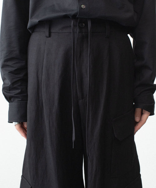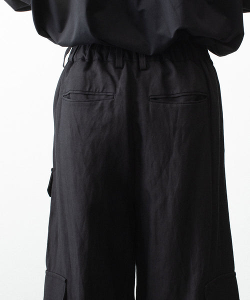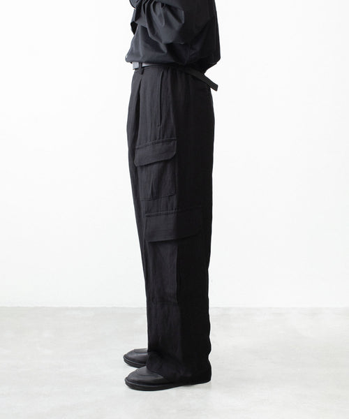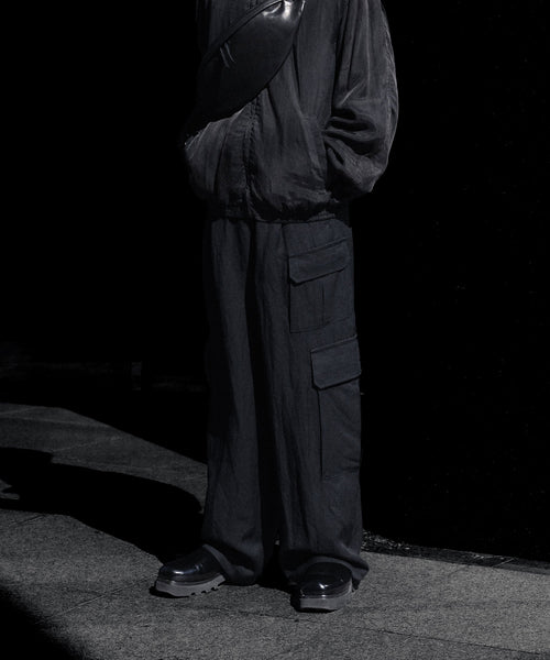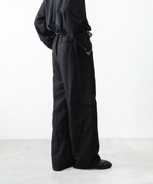 両サイドにカーゴポケットを施したイージートラウザーズ。 両脇線をやや内側にツイストさせ、全体のシルエットにニュアンスを。 イージー仕様のため様々なウエスト位置でジャストで着用可能。