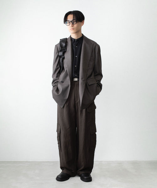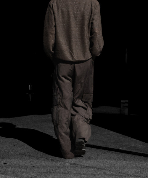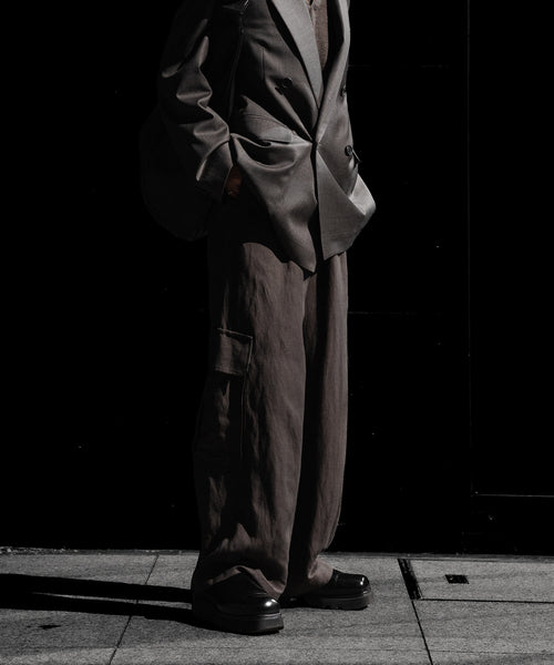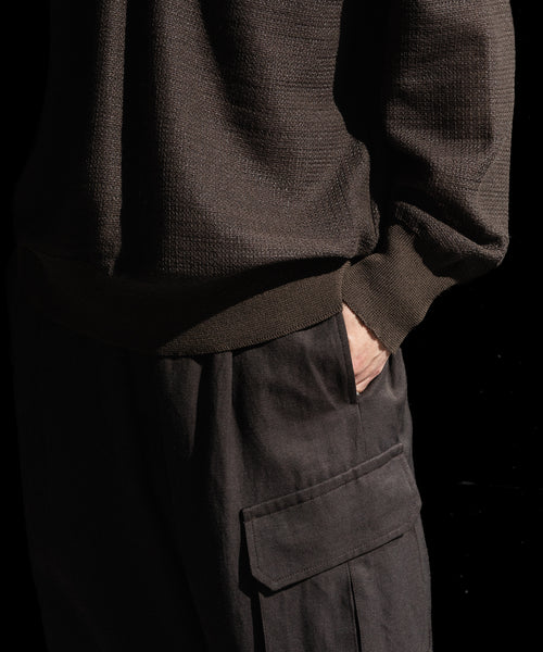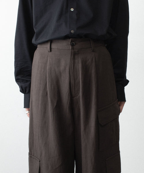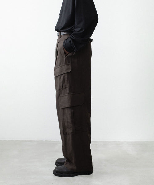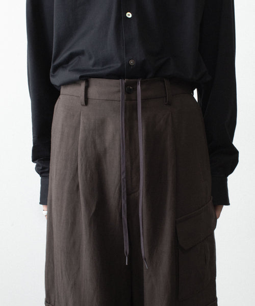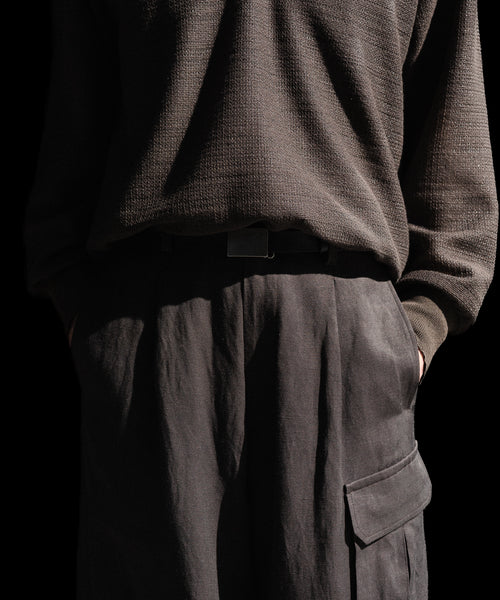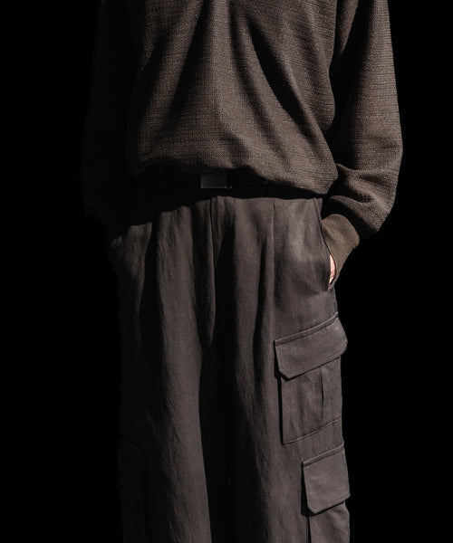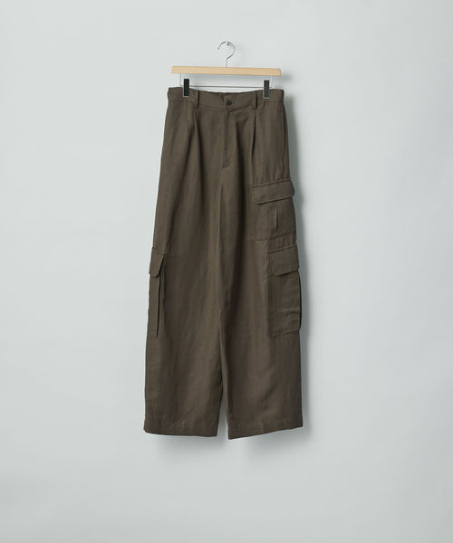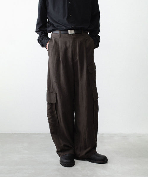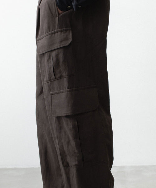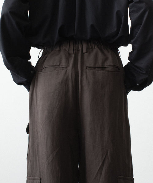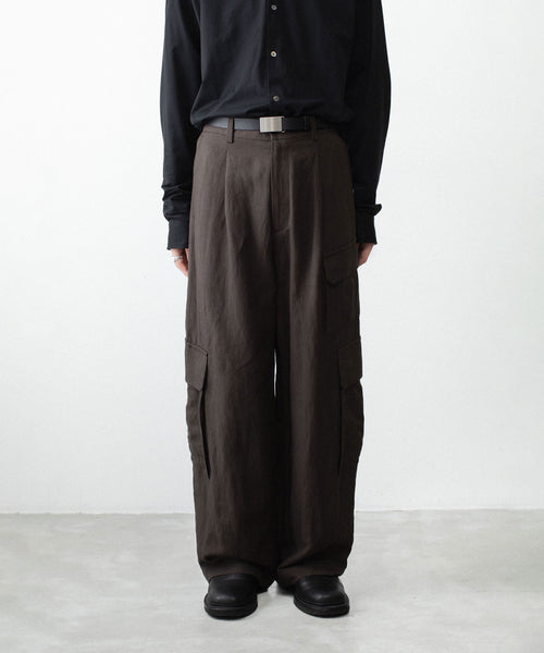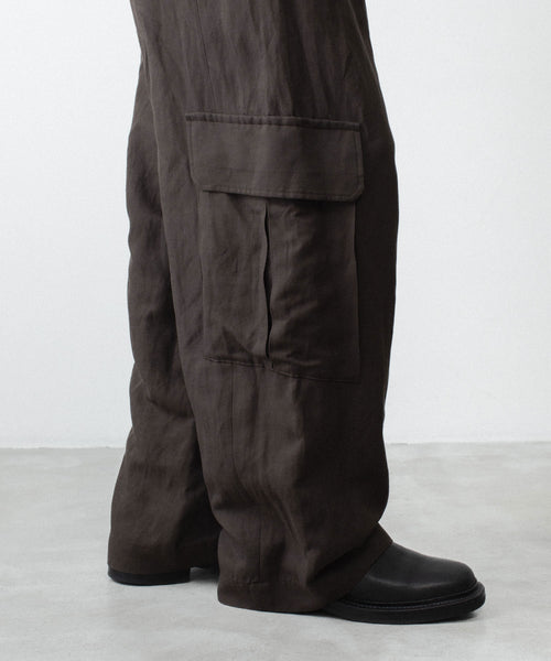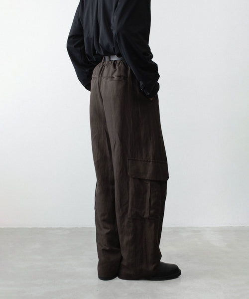 両サイドにカーゴポケットを施したイージートラウザーズ。 両脇線をやや内側にツイストさせ、全体のシルエットにニュアンスを。 イージー仕様のため様々なウエスト位置でジャストで着用可能。
