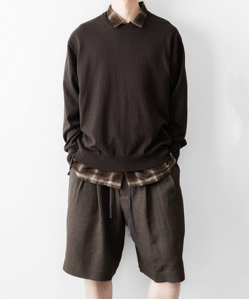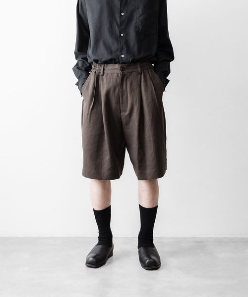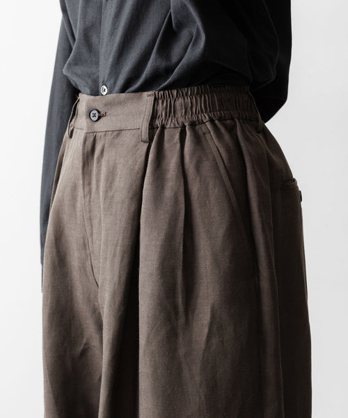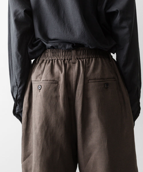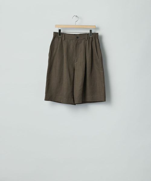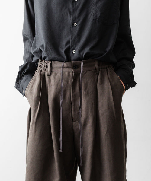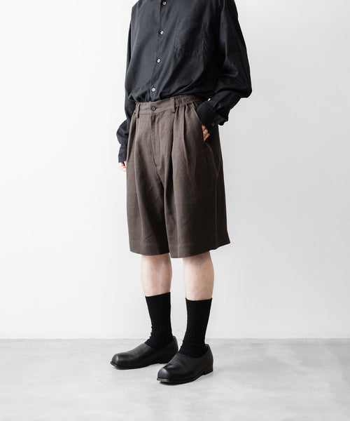 ワイドで丈を長めに設定したショートトラウザーズ。 フロント部分には深めに2タックを入れかっちりした印象を強く出している。 ウエスト部分はゴム、ドローコードのディテールを追加し、よりイージーな着用感に仕上げている。