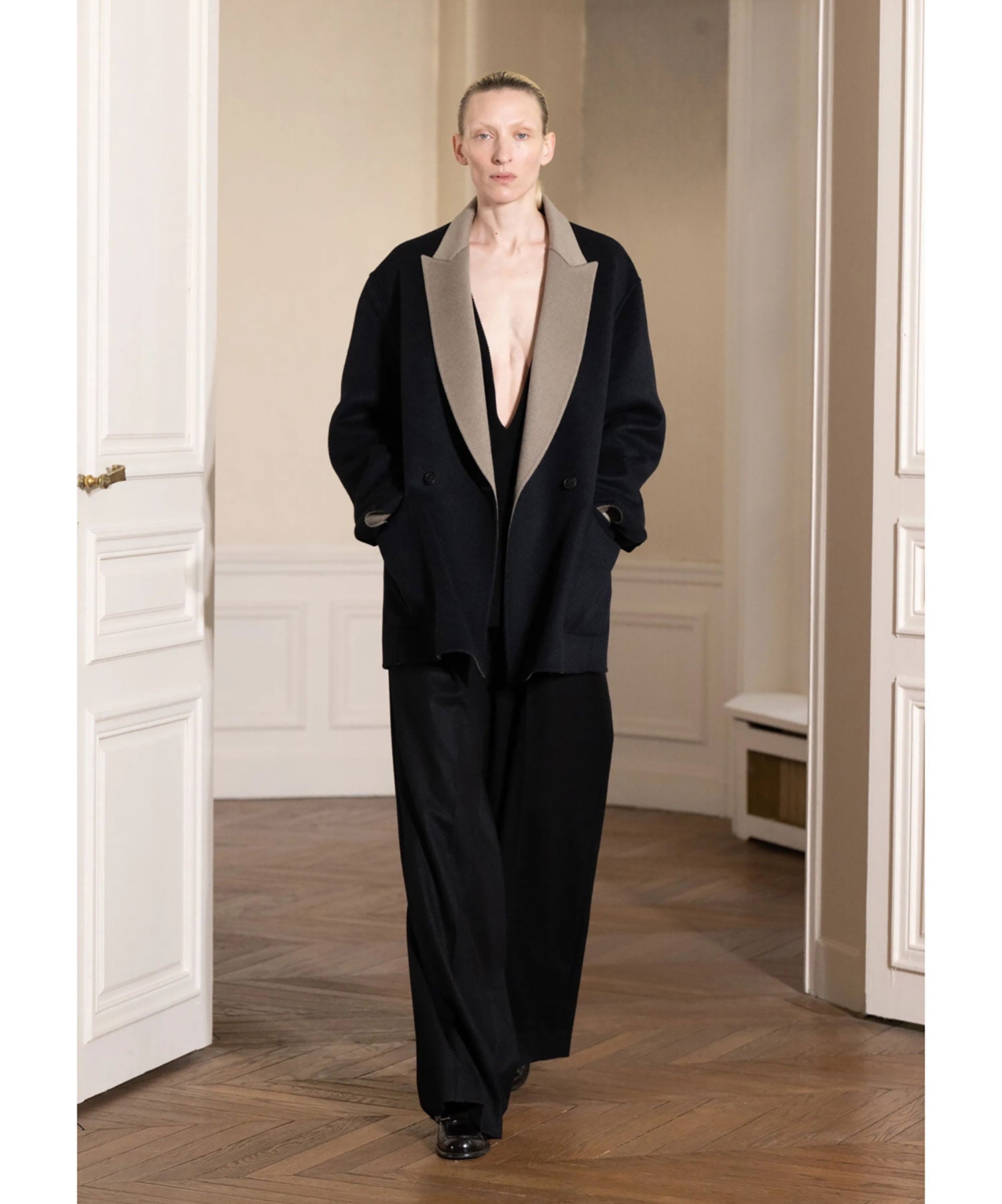 わたり幅から裾幅までスーパーワイドに設定した深めのワンタックトラウザーズ。 腰回りはすっきりとしたフィット感になるよう調整し、ワイドなシルエットながら上品な、エレガントなバランスに仕上がっている。