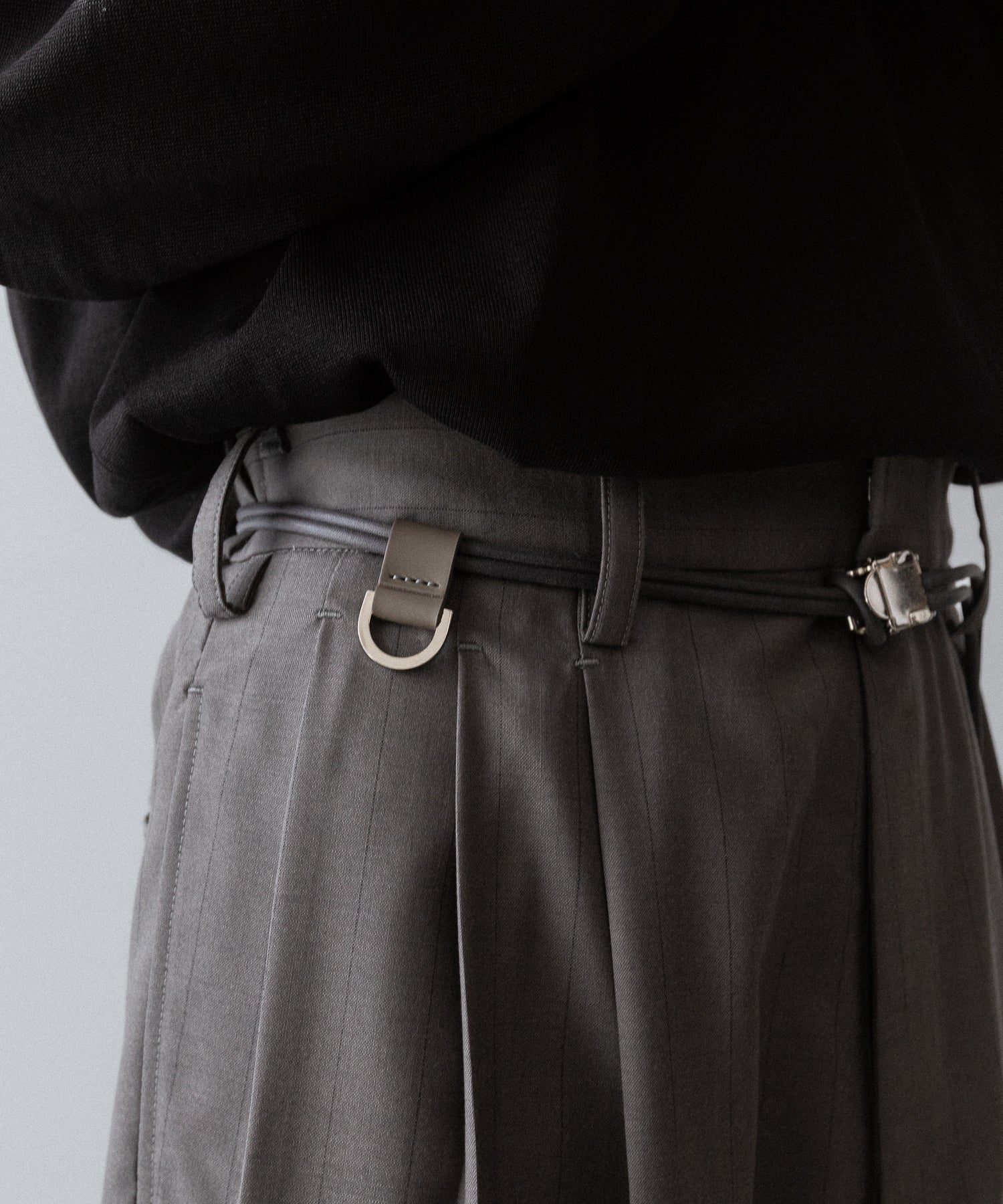 上質なマットガラス仕上げのステアレザーが使用されたラバータッチの剣先と、ワックスがコーティングされたアクリル製のコードとのコントラストが際立つベルトです。クリップ付きのコードで長さを調整する仕様です。